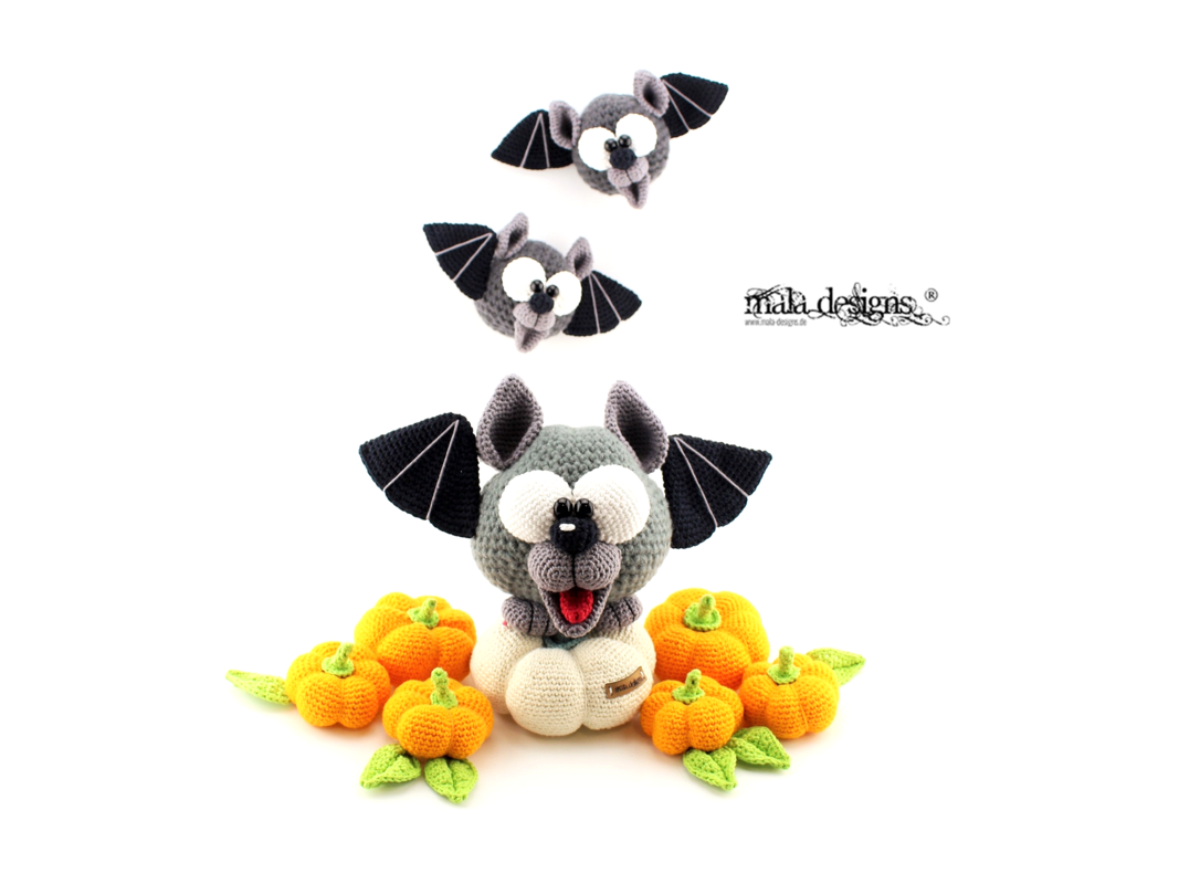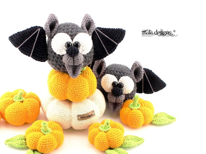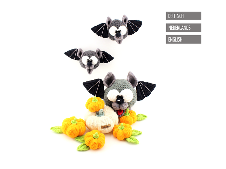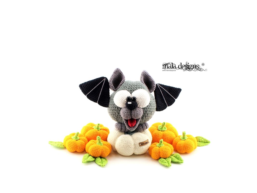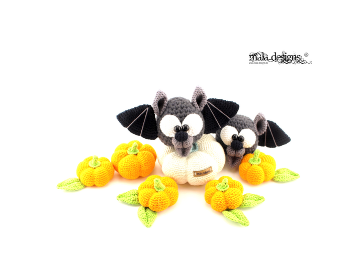 Diese Häkelanleitung beinhaltet die Beschreibung für alle Fledermäuse und dargestellten Kürbissen. Nach Fertigstellung wird die größere Fledermaus ca. 30cm x 18cm (LxH), und die kleineren Fledermäuse ca. 21 cm x 11 cm (LxH) groß.
