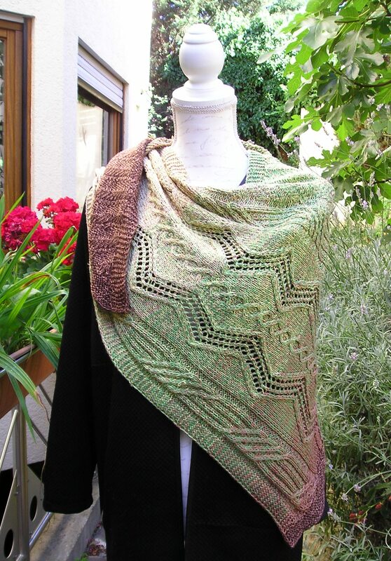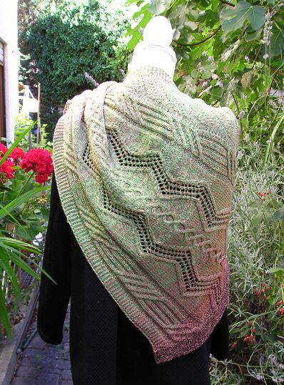 Das Tuch wird aus 250 g 5-fädigem gefachten Baumwollgarn mit Farbverlauf gestickt. Man beginnt an einem Zipfel und nimmt dann an einer Tuchseite kontinuierlich Maschen zu, damit das Tuch in die Breite wächst. So entsteht ein asymmetrisches Tuch, bei dem der kraus rechts gestrickte Rand gleich mitgestrickt wird. Es wird ein breiter Streifen mit Loch- und Zopfmustern sowie mit einem Muster aus rechten und linken Maschen gestrickt. Das ist schon einigermaßen anspruchsvoll zu stricken und daher für StrickanfängerInnen nicht geeignet. Die Anleitung enthält Strickschriften für die einzelnen Muster. Für jedes neue Muster ist außerdem gezeigt, wie damit begonnen wird.