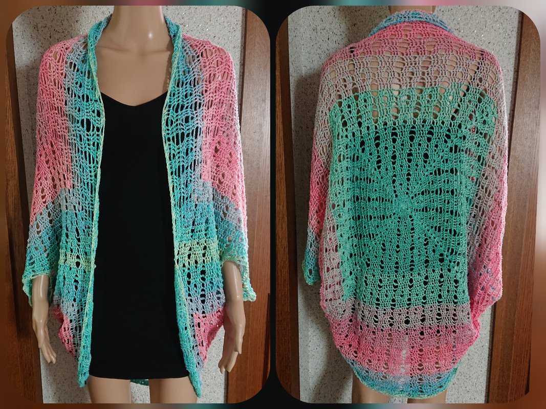 Ich habe für Konfektionsgröße 36 und einer Körpergröße von 1,64m 1200m eines 3fädigen Farbverlaufgarns benötigt.