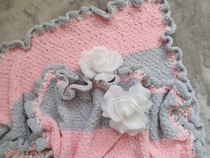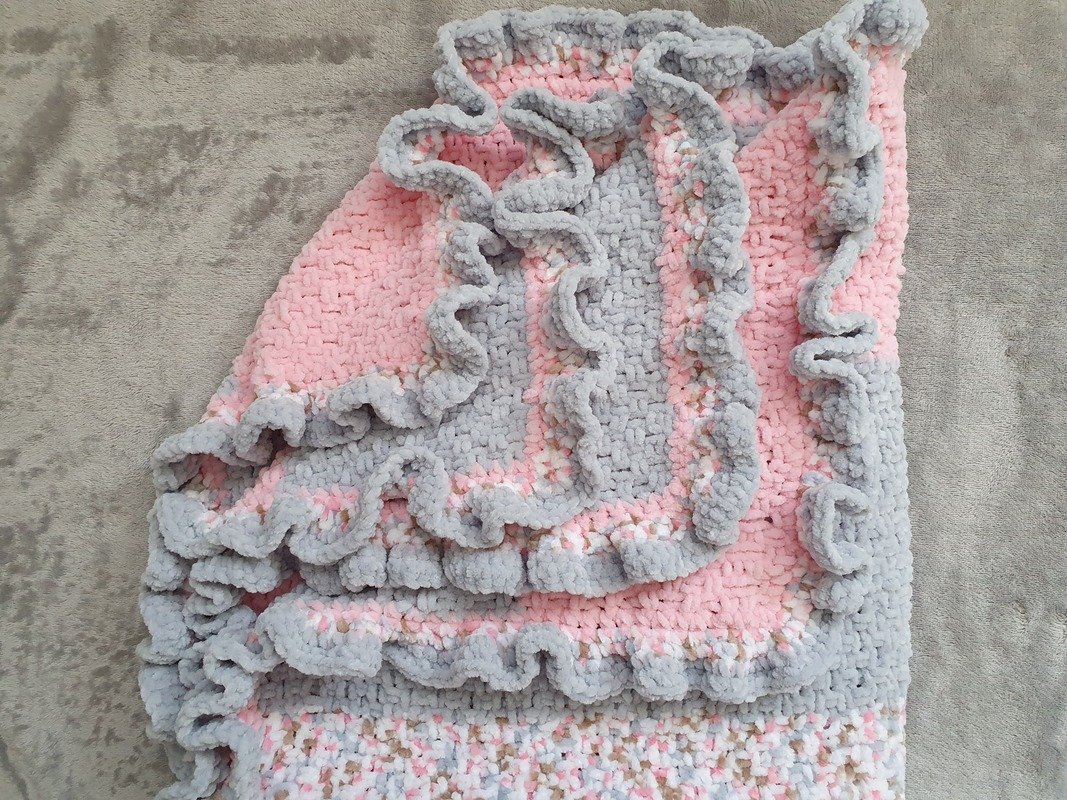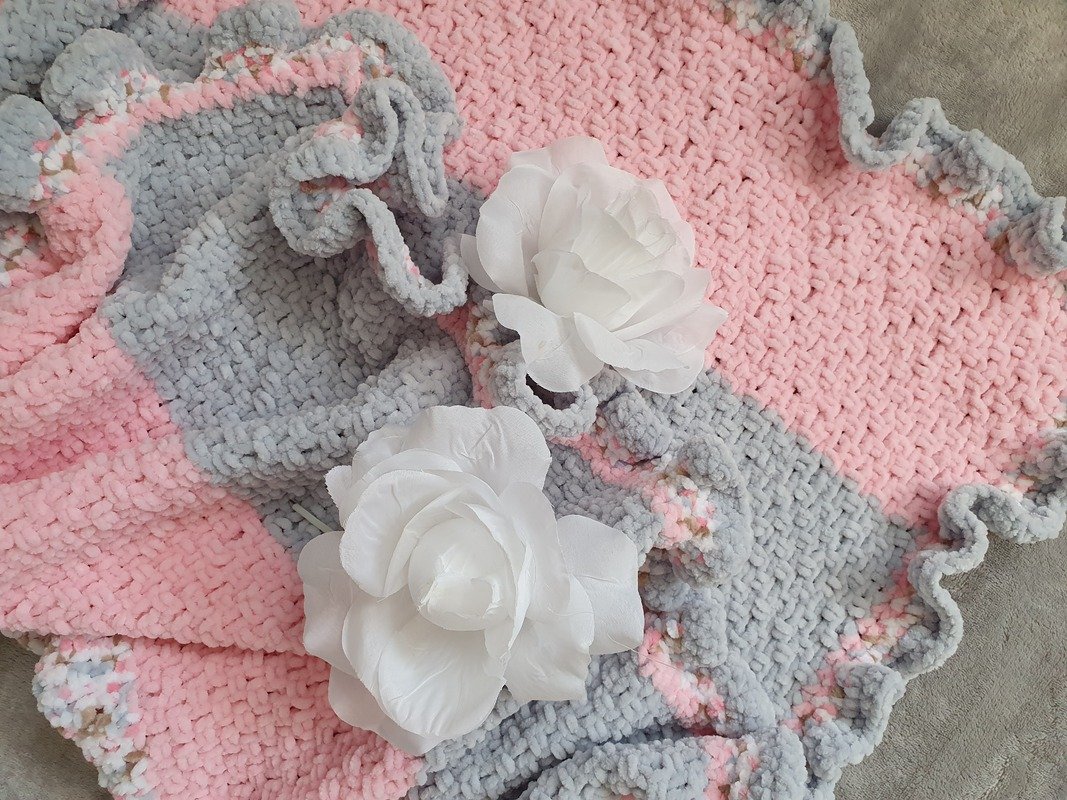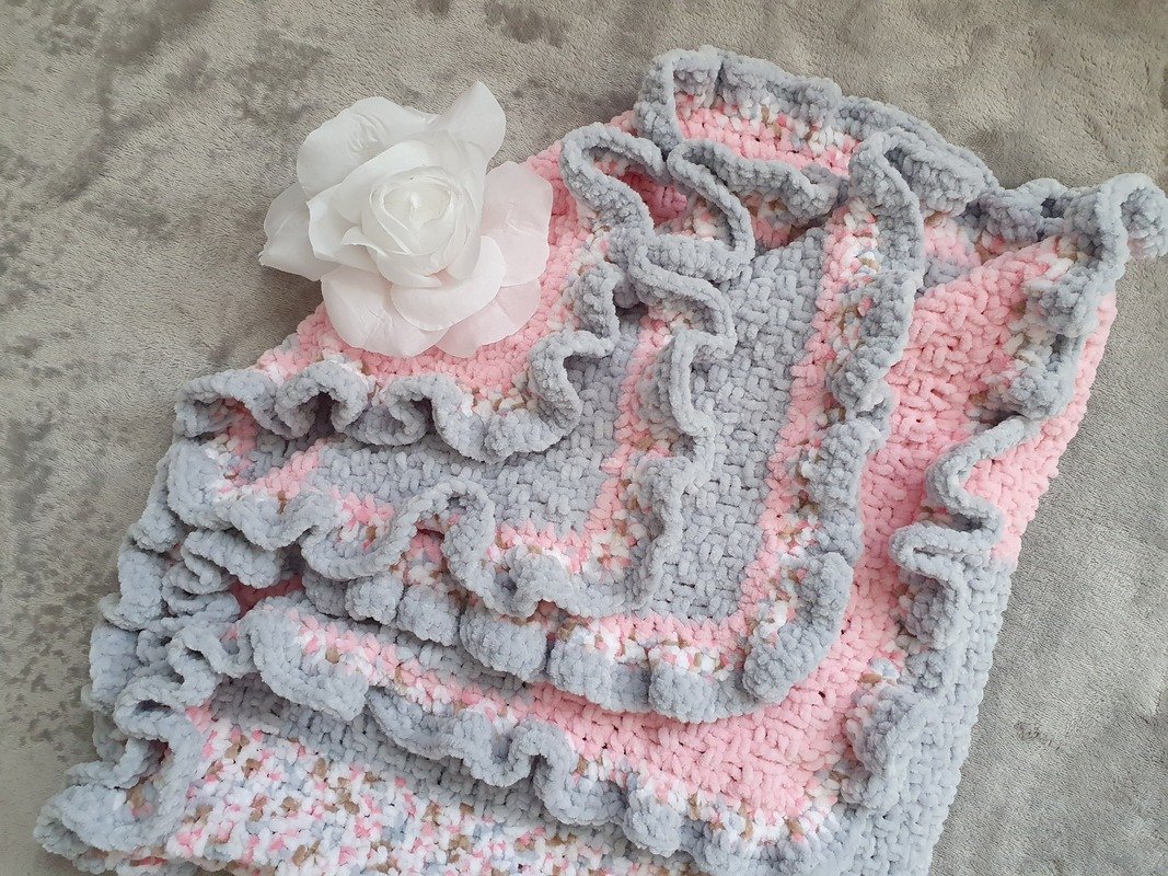 Diese kuschelweiche und leichte Babydecke mit gekäkelter Rüsche aus chenillartiger Wolle ist ein wunderbares Geschenk zur Geburt oder Taufe. Sie ist ein ständiger Begleiter bis ins Krabbelalter und später eine schöne Erinnerung an die Kinderzeit.