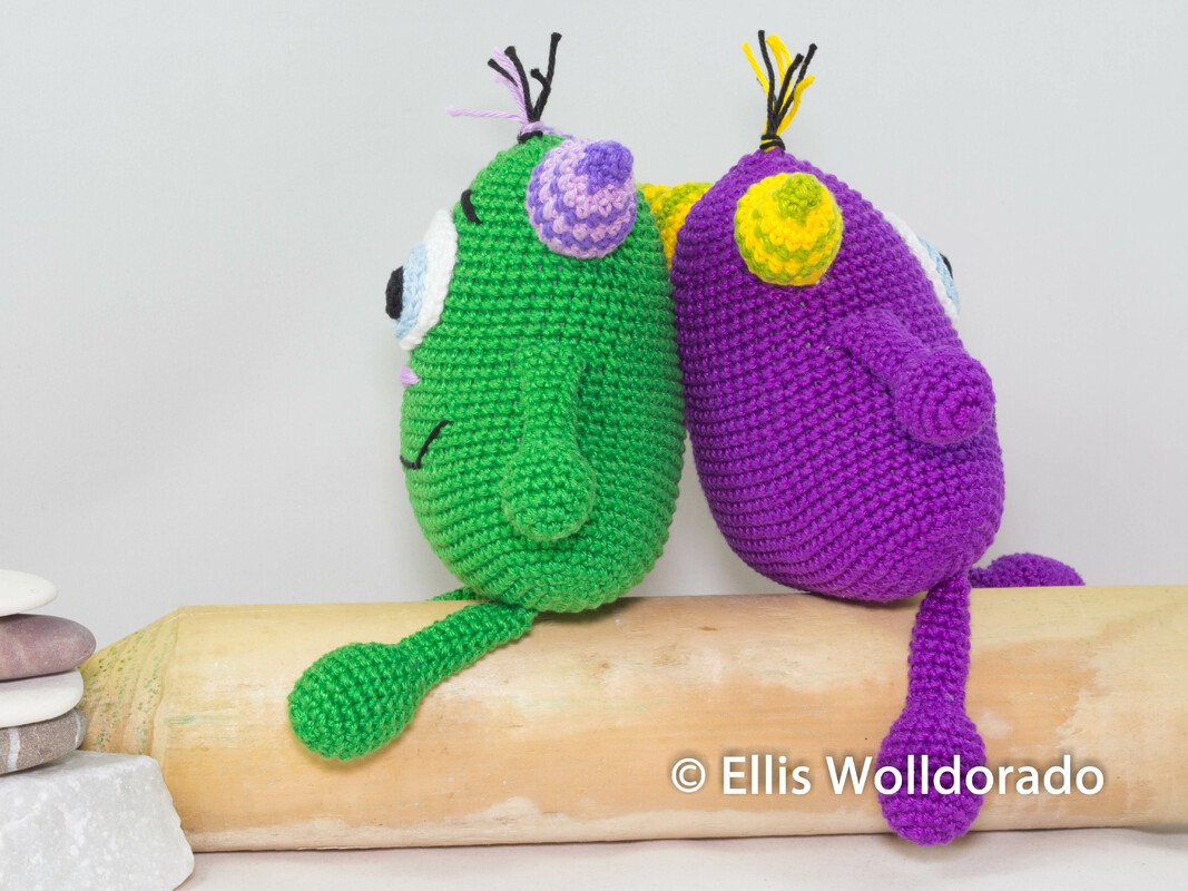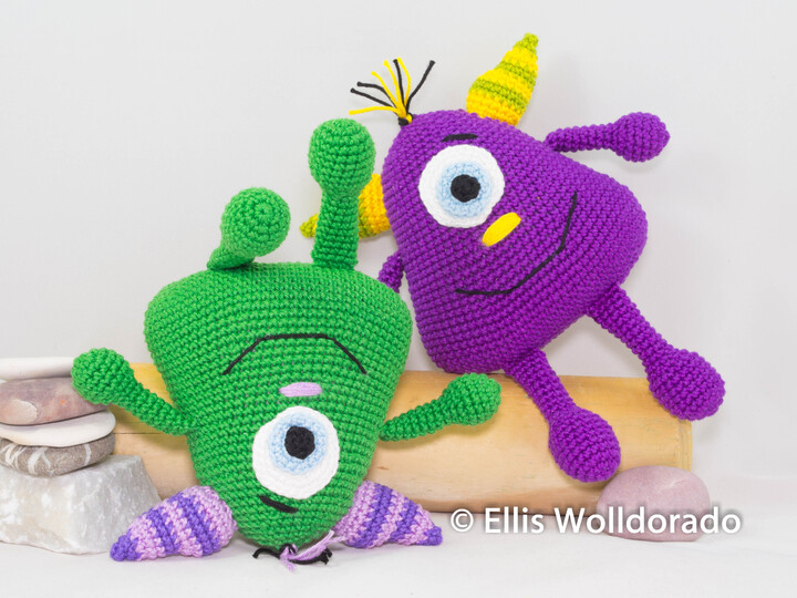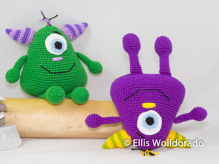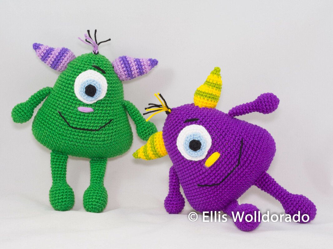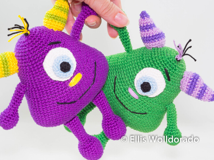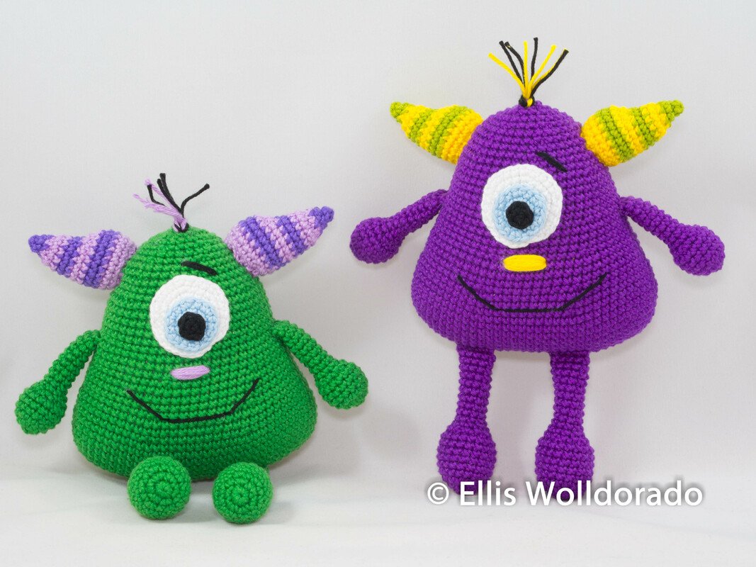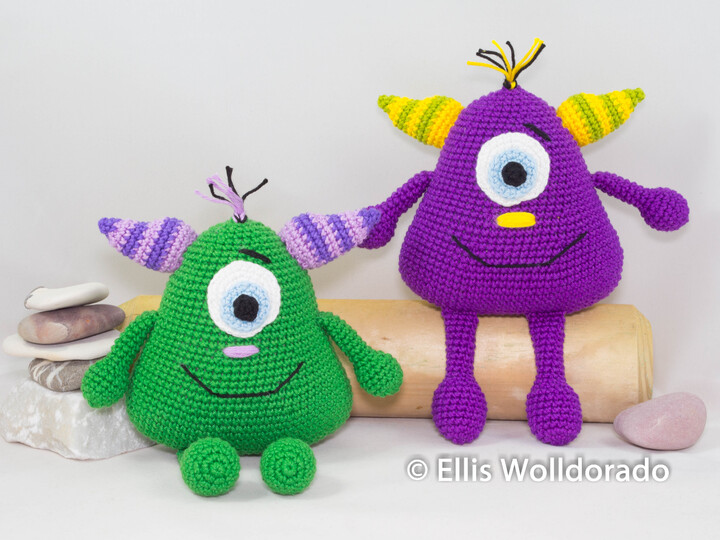 Die hier erhältliche Häkelanleitung (PDF-Datei) beschreibt ausführlich in Wort und Bild, wie Du die dreieckigen Monster nacharbeiten kannst.
