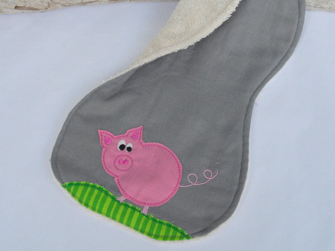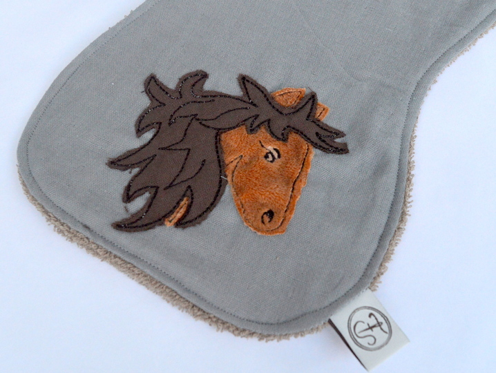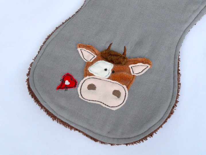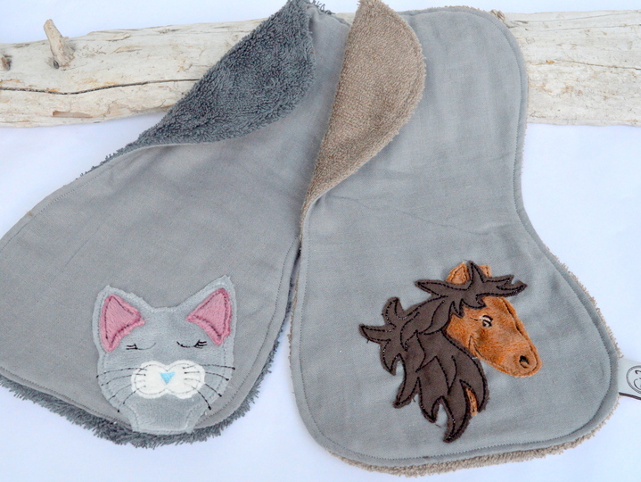 Dem ZIP sind 5erlei Varianten enthalten: Spucktuch mit Kuh, Katze, Schaf, Schwein, Pferd.