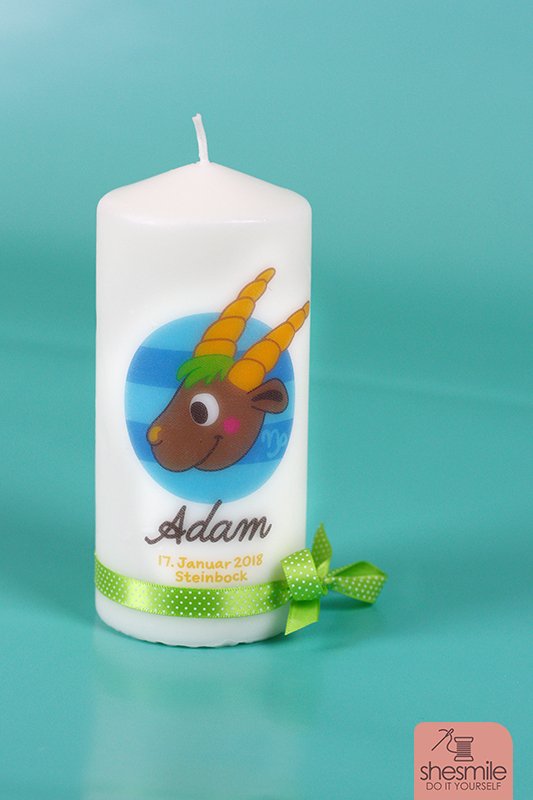 In unserer Familie gibt es die schöne Tradition die Taufkerze zu jedem Geburtstag aufzustellen und anzuzünden. Mein Patenkind ist nicht getauft. So bin ich auf die Idee gekommen zum 1. Geburtstag eine Sternzeichen-Kerze zu gestalten und zu verschenken. Die Bastelanleitung "Kerzen bedrucken mit Servietten" findest du in einem anderen E-Book. Die passende Bilddateien gibt es hier in diesem Digistamp-Set.