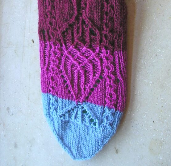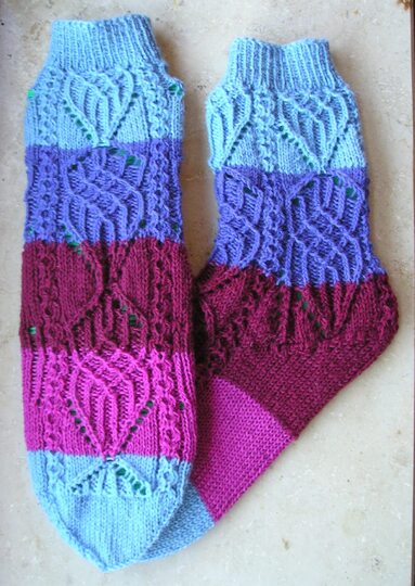 Anleitung zum Stricken der Socken "Gitter" aus Zopfmustern und Lochmustern kombiniert.