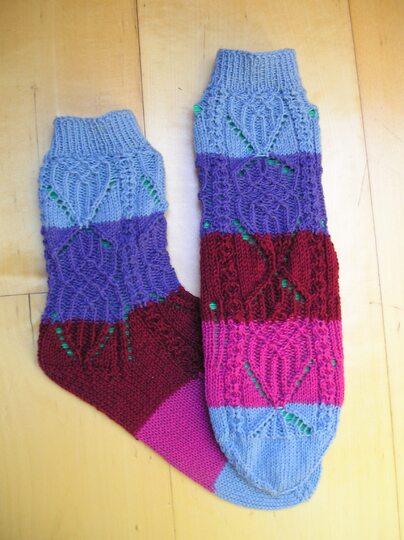 Die Socken werden mit 4-fädiger Sockenwolle gestrickt. Hier wurden verschiedene Reste verwendet. Die Socken werden aber auch sehr schön, wenn man sie einfarbig strickt. Das Muster besteht aus einem Gitter, das sich aus Lochmustern kombiniert mit Wickelknoten und rechten und linken Maschen zusammensetzt. Die Gitter werden von kleinen Zöpfen eingerahmt. Die Fußsohle wird glatt rechts gestrickt. Für die Ferse wird die neue Knittelferse verwendet, die besonders gut am Fuß sitzt. Das Muster zu stricken ist aufwändig und erfordert viel Konzentration.