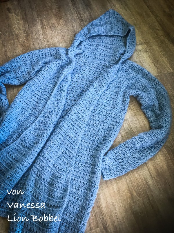 Kapuze: 110 Stäbchen 16 Reihen lang gehäkelt – breite Kapuze