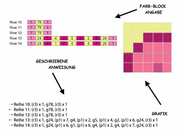 -farbige Zahlen-Blöcke für jede Reihe für feste Maschen (Stb od. hStb)
