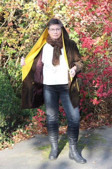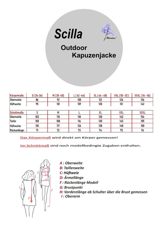 Beim Schnitt „Kapuzenjacke Scilla“ handelt es sich um eine schöne, große, Jacke mit angeschnittener Kapuze, die mit einer tollen kontrastreichen Innenkapuze gefertigt werden kann. Die Jacke kann weit übereinandergeschlagen werden, damit sie schön warmhält. Diese Anleitung beinhaltet einen kompletten Futterschnitt, dass z.B. aus Fell, Vlies, Strick oder anderem Kontraststoff etc. genäht werden kann. Wie immer, ist das Geschmacksache und kein muss. Die Jacke hat eine Weite, die je nach gewählter Größe das Tragen eines dicken Pullis zulässt. Grundsätzlich sei angemerkt, dass die Sommervariante eine Größe kleiner gefertigt werden kann als die für den Winter. Die Jacke ist in einer Länge vorgegeben, die nur kurz über den Po geht, damit sie sich beim Autofahren und sitzen bequem tragen lässt. Wer mag, kann sich einen Mantel daraus schneidern, indem der Jackenschnitt einfach entsprechend verlängert wird.