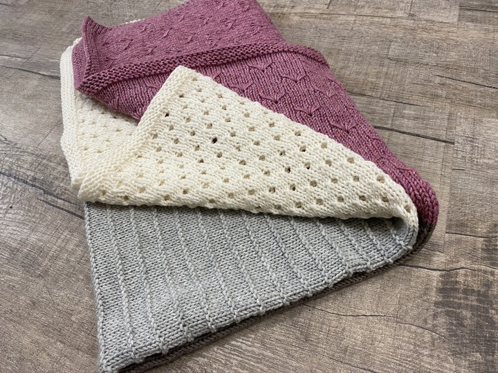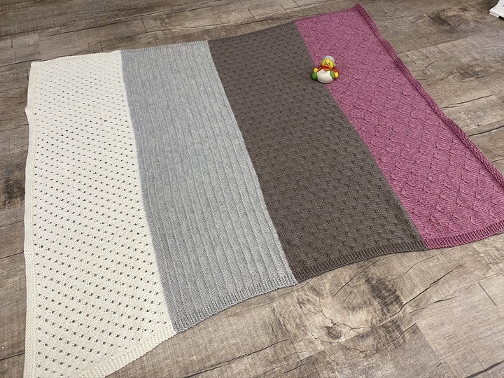 Diese Babydecke habe ich aus 100% Merinowolle extrafine 120 von RELLANA im Mustermix gestrickt. Die Blenden sind gleich mit angestrickt. Die Muster sind im Text beschrieben und benötigen keine Strickschrift. Die Muster sind einfach, jedoch ist ein wenig Strickerfahrung nicht schlecht. Es ist ein einfaches Ajourmuster dabei und ein Blütenmuster. Die Farbauswahl ist vielfältig und kann auch einfach in eine Decke für Jungs umgewandelt werden, wenn du anstatt der Farbe Erika ein Petrol verwendest.