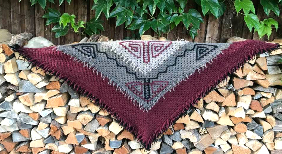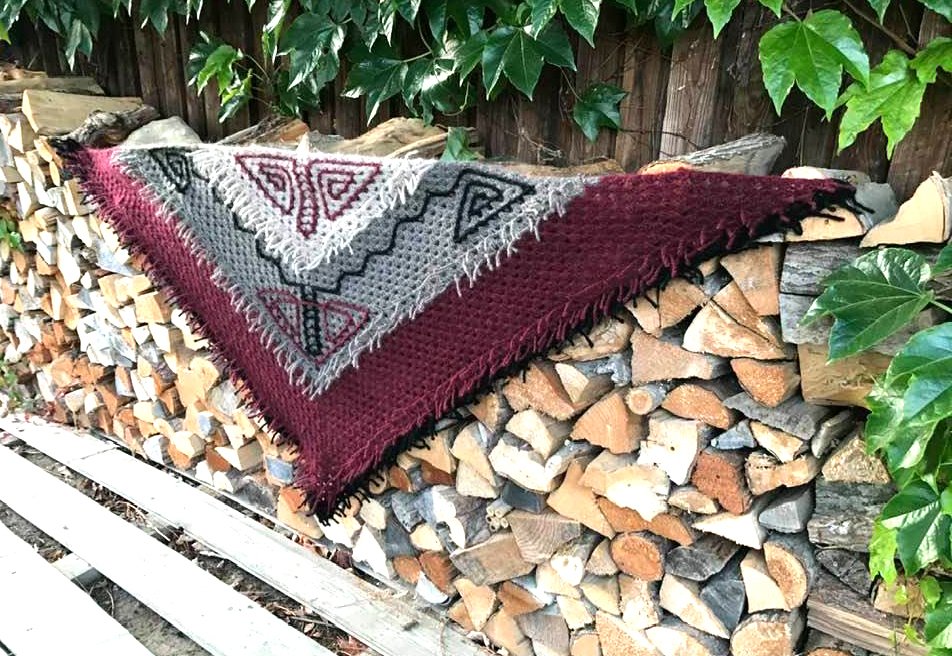 Mein fertige Tuch wiegt 300 Gramm und ist an der langen Kante 230 cm lang und an der Spitze 100 cm breit