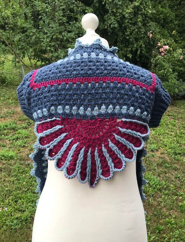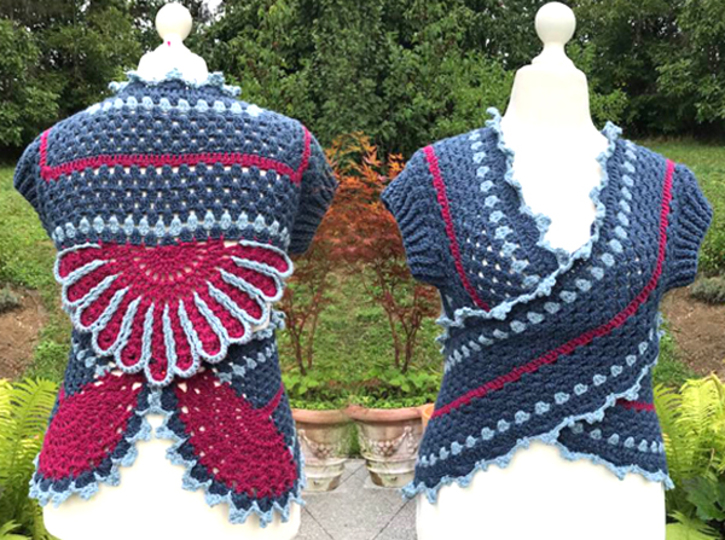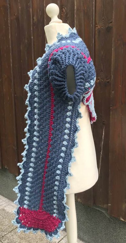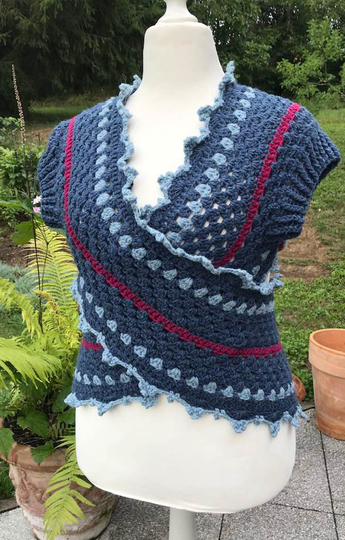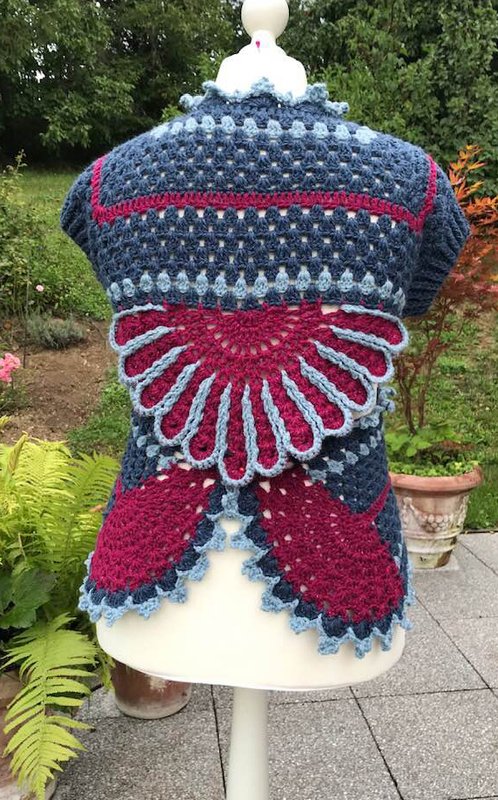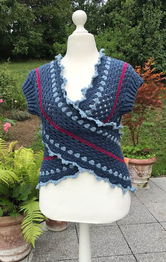Die vielseitige Weste kann man um seinen Körper wickeln, oder offen hängen lassen, oder auch vorne knoten. Nur hinten geknöpft ist sie wie eine wärmende Weste.