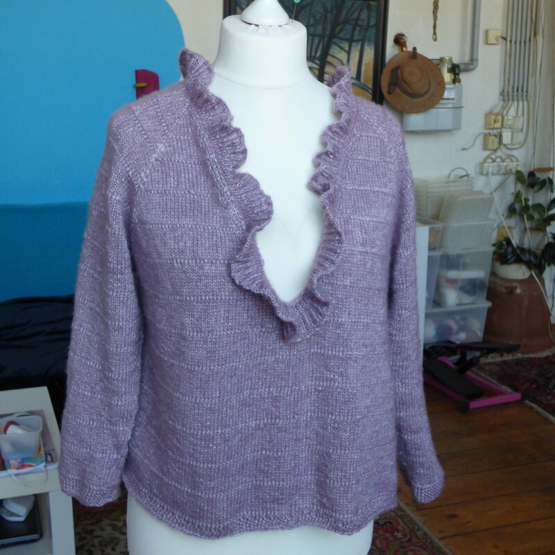 Mein neuer Lieblingspullover in einem wahrhaft luxuriösem Garn: Saloppe Kastenform, tiefer Halsausschnitt, ein puristisches Muster mit feinen Details und einem verspielten Rüschenkragen als Kontrast...