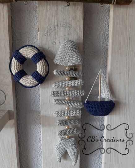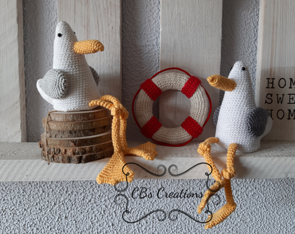 Baumwolle von Lammy Yarns Rio und Yarn & Colors (100% Baumwolle, 50gr/125m) in die Farben: Weiß (Möwe, Segelboot),verwendet für 1 Möwe: 20gr, Segel: 2gr.