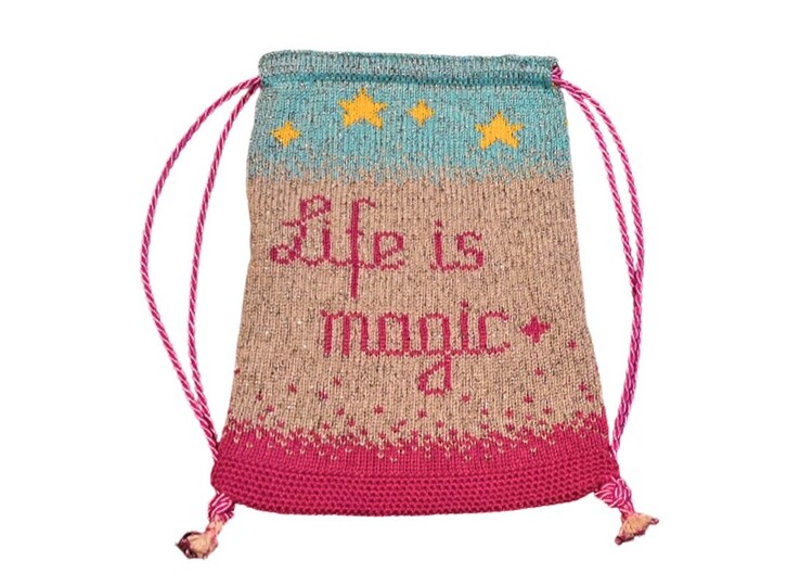 Der Turnbeutel wird in Doubleface gestrickt. Dabei werden in gewissen Abschnitten die Farben gewechselt, so dass dieses mehrfarbige Bild entsteht. Der beilaufende Glitzerfaden funkelt im Licht und lässt das Motiv richtig magisch erscheinen. Der Boden wird mit festen Maschen in Runden gehäkelt.