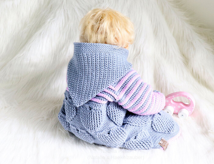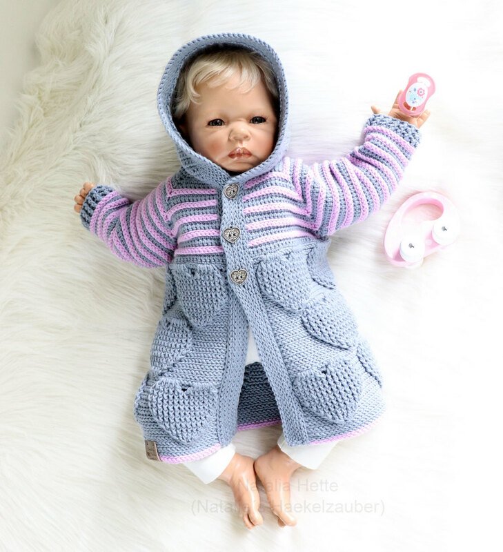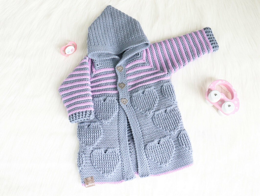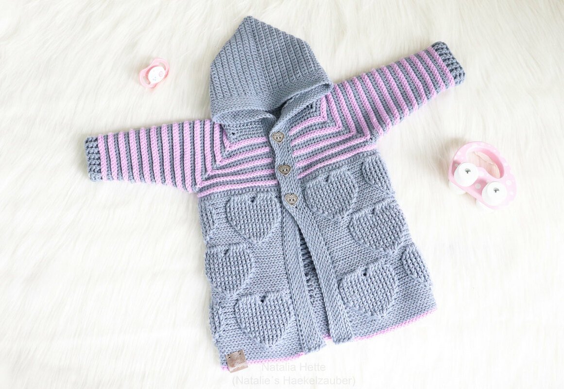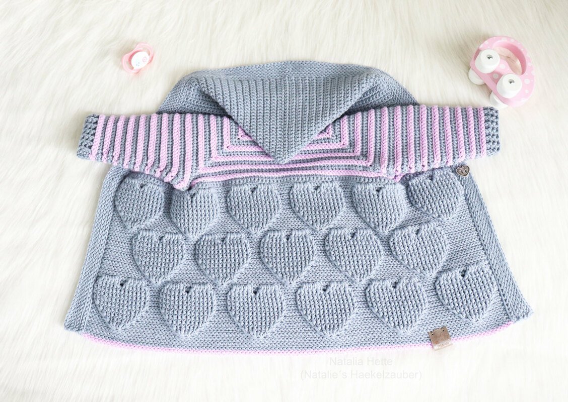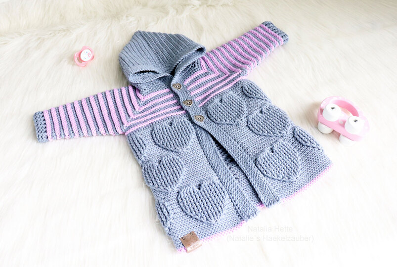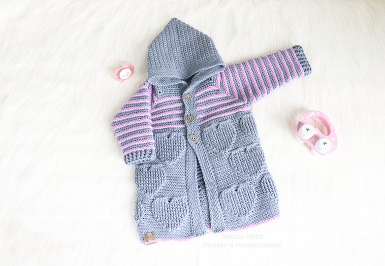 Möchtest Du eine Jacke für dein Kind häkeln, die wie gestrickt aussieht? Dann ist diese Häkelanleitung genau für Dich gedacht. Eine Baby- & Kinderjacke mit einer Kapuze und Reliefmuster "Herzen" ist ein echter Hingucker.