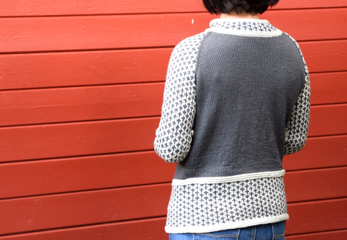 Celina ist sozusagen die kleine Schwester meines Pulloverdesigns "Birte". Dieses Modell ist allerdings ein wenig weiter und wird hauptsächlich in Runden gestrickt. Lediglich ab Beginn des Raglansausschnitts wird in Reihen weitergestrickt und die Ärmel anschließend eingenäht. Besonderer Hingucker ist hier der breite Bund im Jaquardmuster in Vorder- und Rückenteil. Auffällig ist der etwas halsferne Stehkragen (ebenfalls im Jaquardmuster), der selbst bei empfindlicher Haut keine Kratzprobleme verursacht.