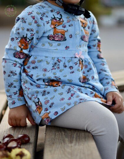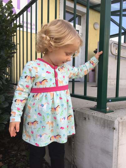 Gr. 74 – 164 in Einzelgrößen umfasst der Schnitt, den du idealerweise aus Jersey oder