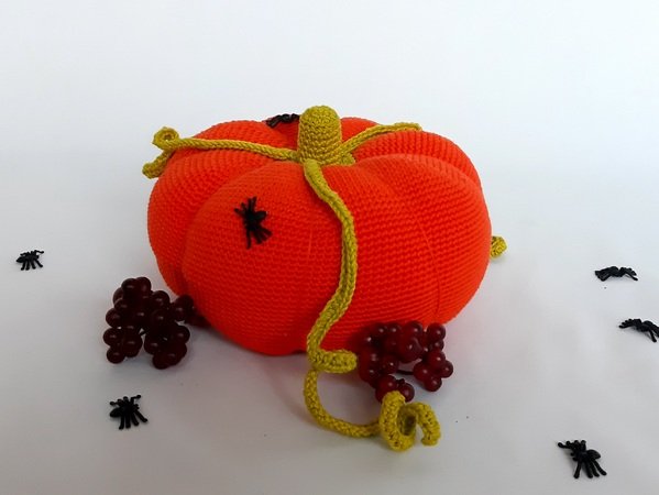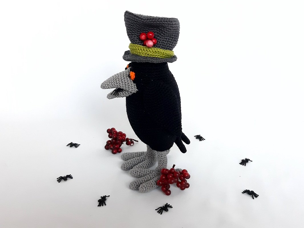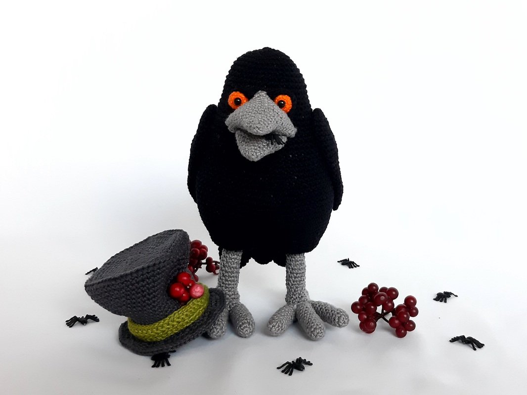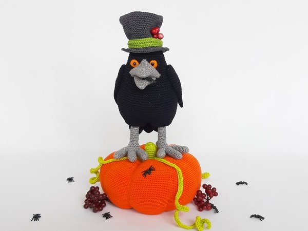Mit dieser PDF erhalten Sie eine Häkelanleitung für den Raben mit seinem Zylinder und den großen Kürbis.
