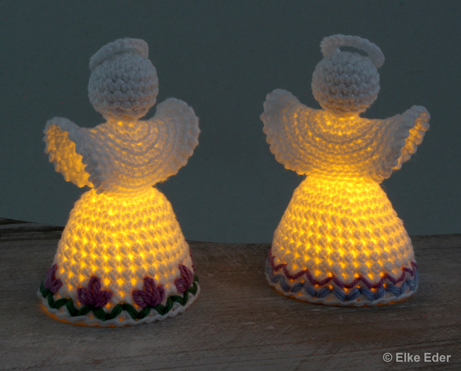 Die weißen Engelchen leuchten mit einem LED-Teelicht darunter zauberhaft im Dunkeln. Die bunten Engel sind hierfür nicht so geeignet, da sie zu viel Licht verschlucken.