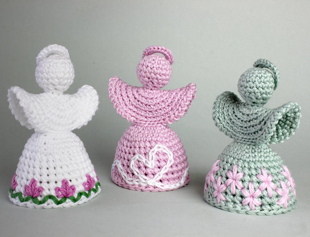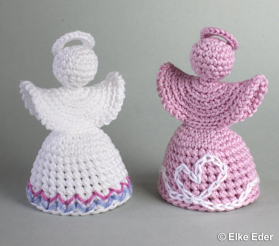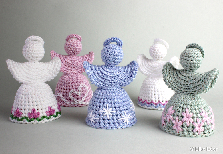 Der Rock des Engels besteht aus Doppelmaschen, welche eine hervorragende Basis für Stickmuster bieten. Der Engel ist so konzipiert, dass im Bereich der Doppelmaschen keine Zunahmen erfolgen - dadurch sind sie wunderbar zum Besticken geeignet. Hier sind keine Grenzen gesetzt - du kannst sie wie gezeigt besticken oder deine ganz eigenen Kreationen erschaffen - so wird garantiert jeder Engel zum Unikat. Falls du es lieber klassisch und schlicht magst, kannst du den Engel auch einfach unbestickt lassen (s. Bilder).