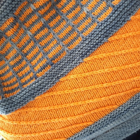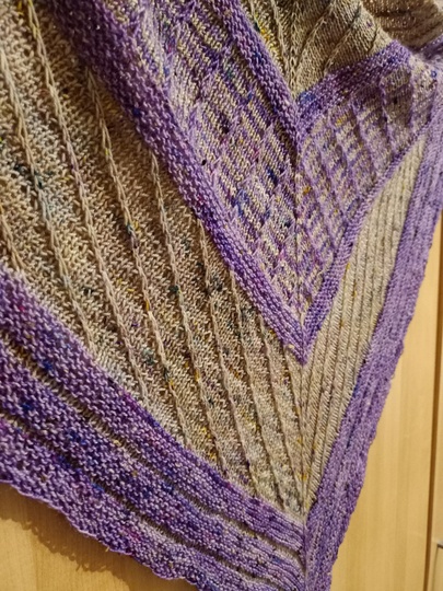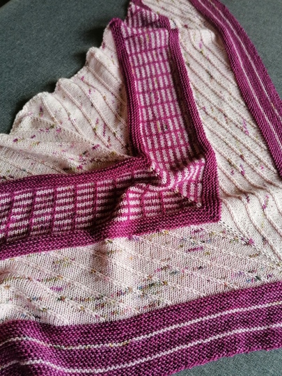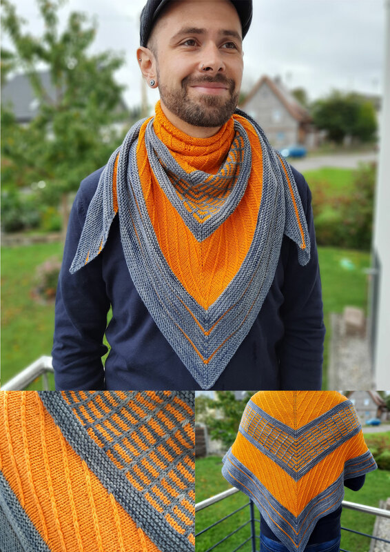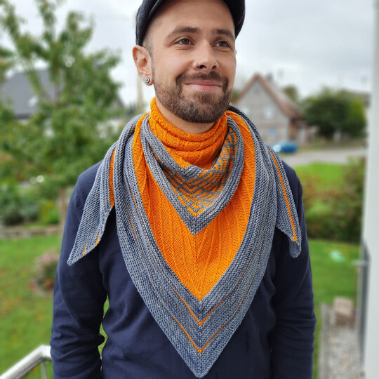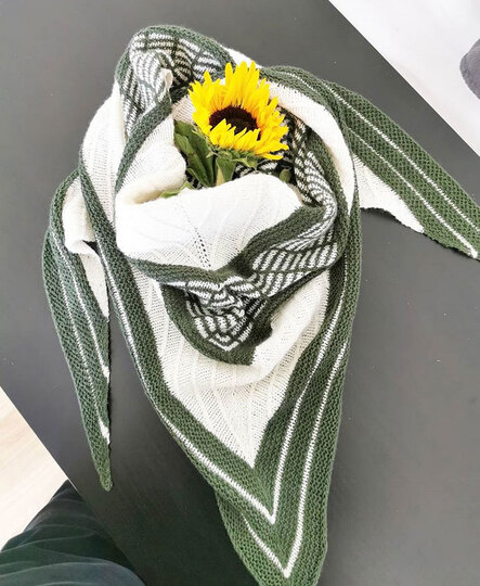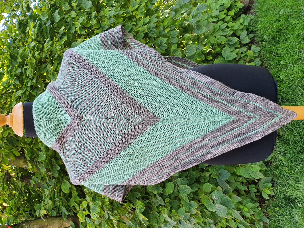 Das Dreieckstuch „Lines and Tiles“, zu Deutsch Linien und Kacheln, verbreitert sich aus der Mitte heraus mit einer Mittelmasche und einer kraus rechten Bordüre an den Außenkanten.