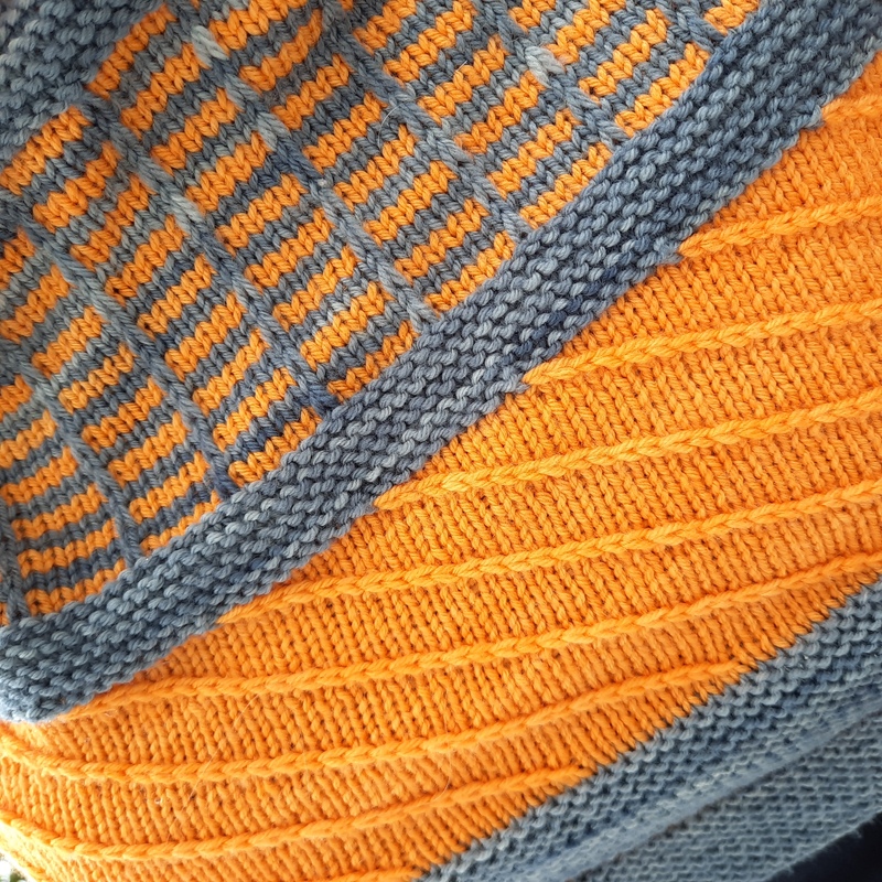 In der Anleitung werden 2 kontrastreiche Farben in 3 unterschiedlichen Mustern verwendet. In der Anleitung werden rechte und linke Maschen, Hebemaschen und verkreuzte Maschen verwendet.