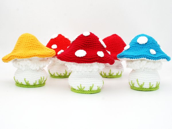 Mit DK Garn (z.B. Puppets Lyric 8/8 oder doppelt genommene Catania) und 3.0 mm Nadel wird der Pilz 12 cm hoch und 12 cm breit.