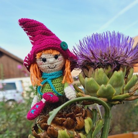 • Wolle, ich habe Catania (50g 125 m) für die größere Hexe verwendet, die Mondial bio soft cotton (50 g 180 m) für die kleinere Hexe du kannst aber natürlich auch ein anderes Garn deiner Wahl verwenden, dadurch ändert sich aber die Größe deiner Figur.