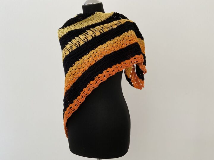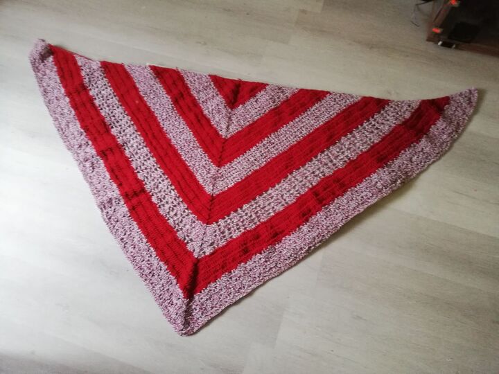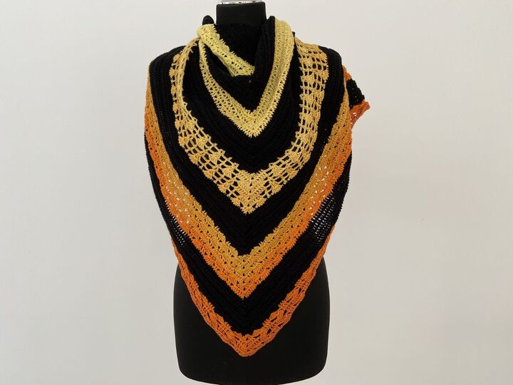 Unter Verwendung des angegebenen Materials wird das Tuch ca. 140 cm breit und an der Spitze ca. 75 cm tief.