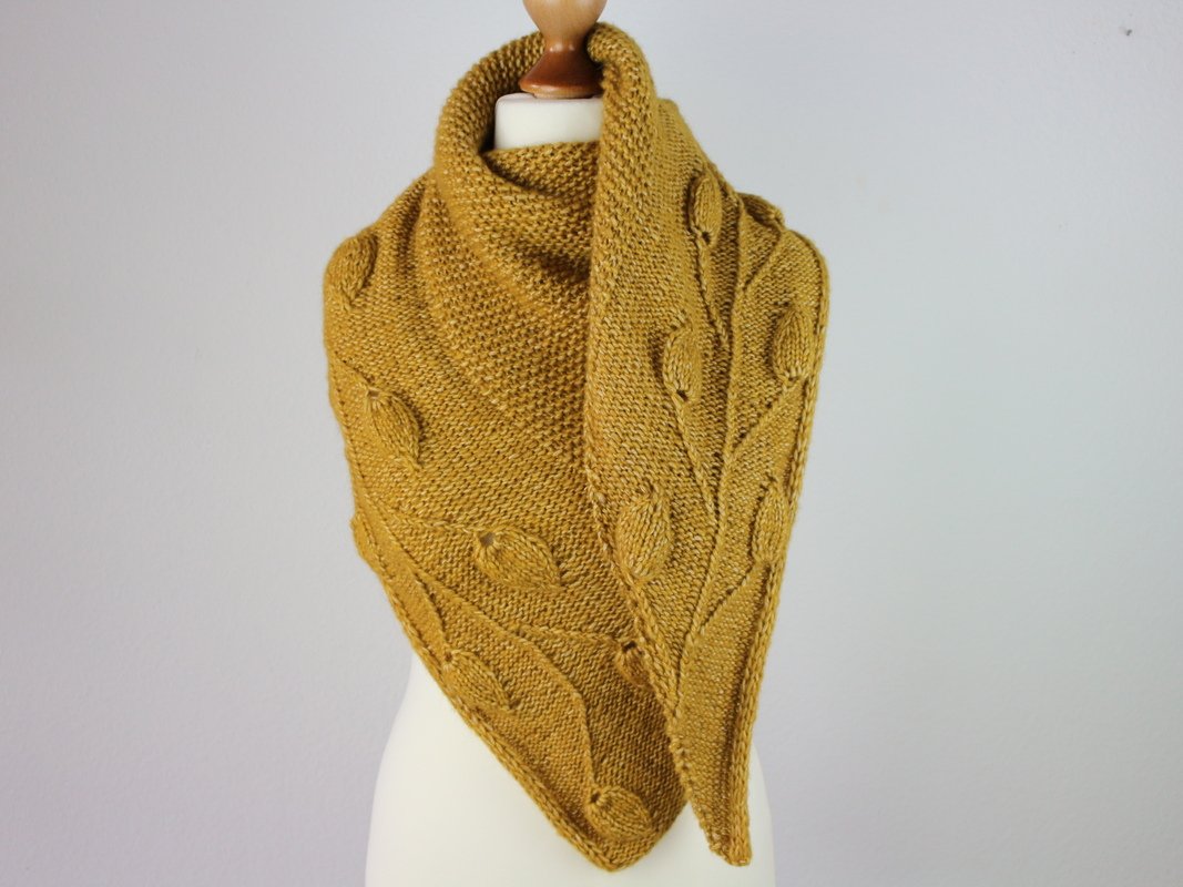 DasTuch "Golden Leaves" ist ein asymetrisches Dreieckstuch, dass mit nur wenigen Maschen beginnt und im laufe des Strickprozesses immer größer wird.