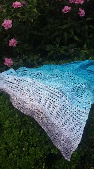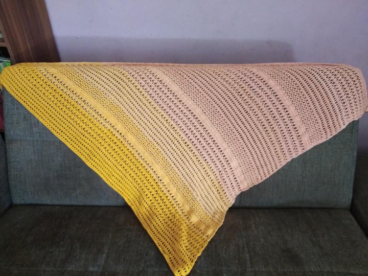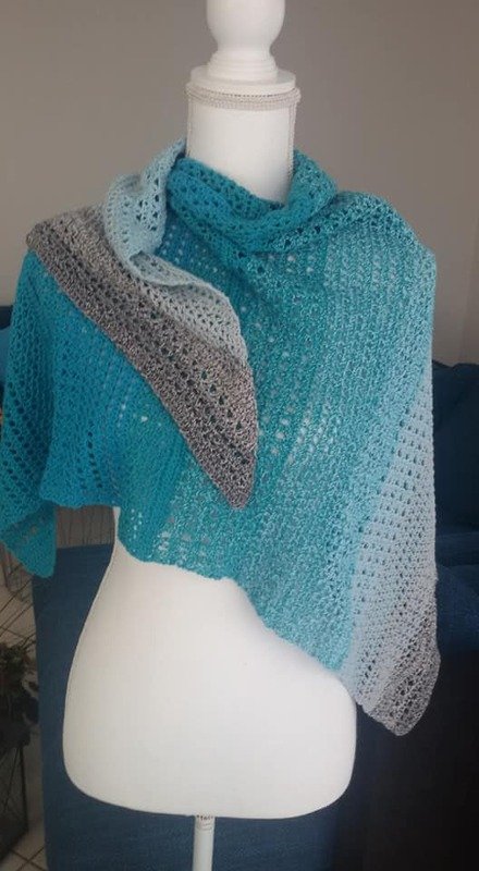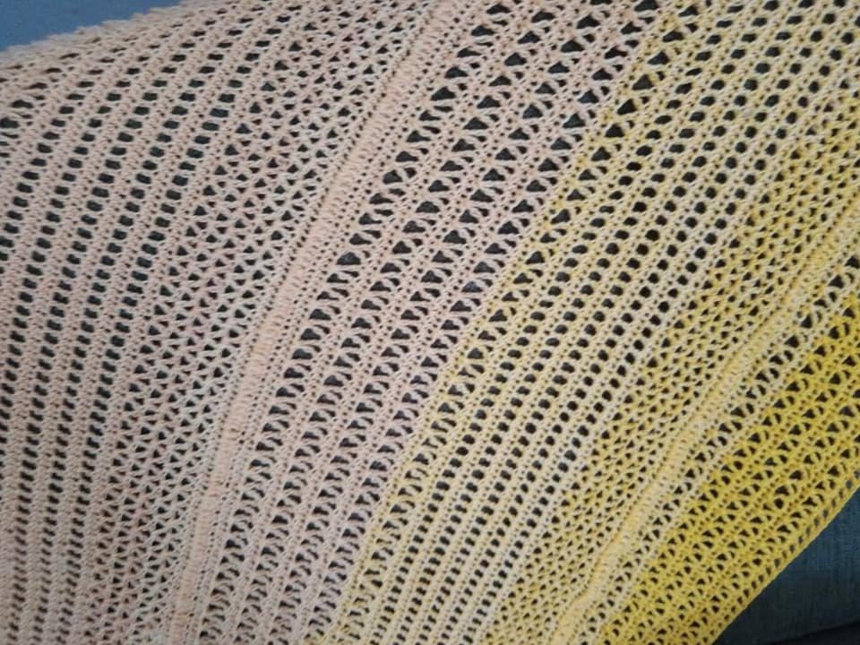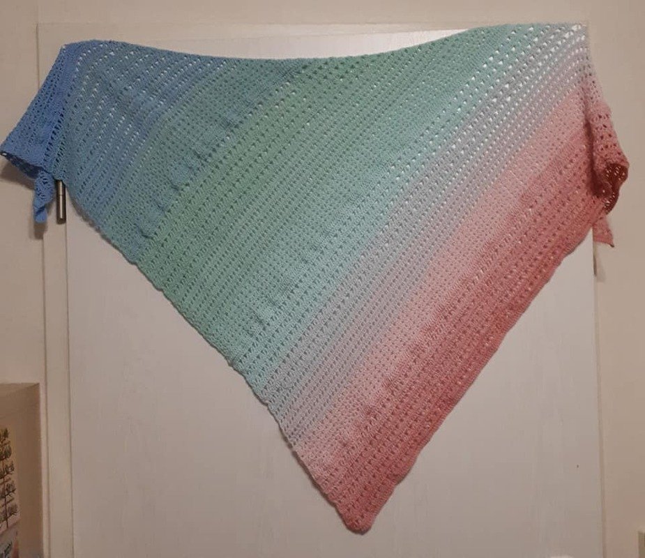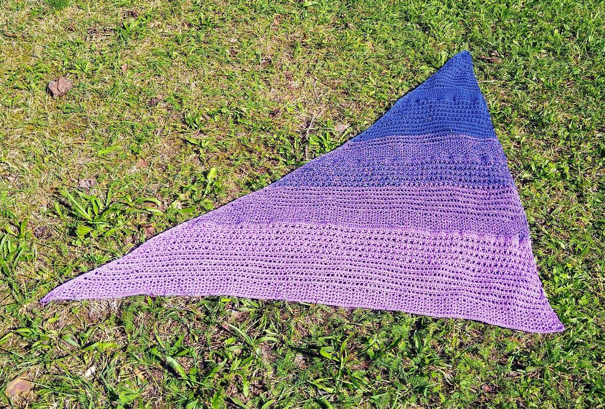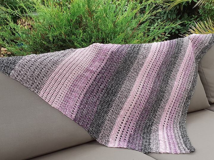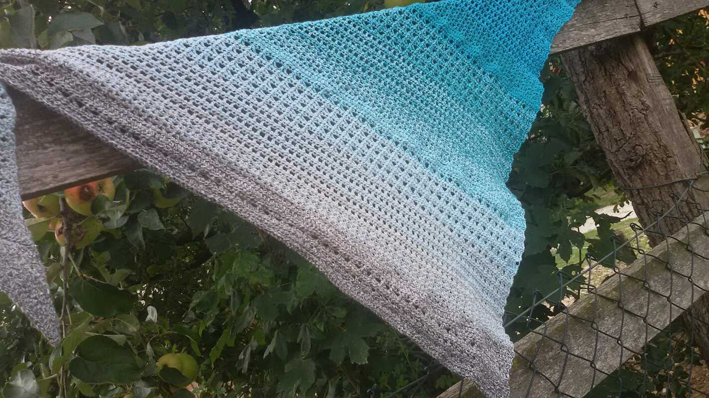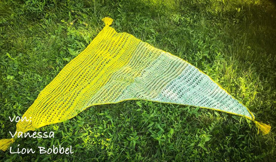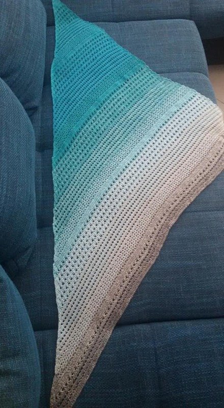 Das Tuch Samantha wird von einer Ecke gehäkelt. Es sind 3 Mustersätze und ab ca Mitte des Tuches wiederholt es sich. Somit kann man es bei Bedarf nach blieben erweitern.
