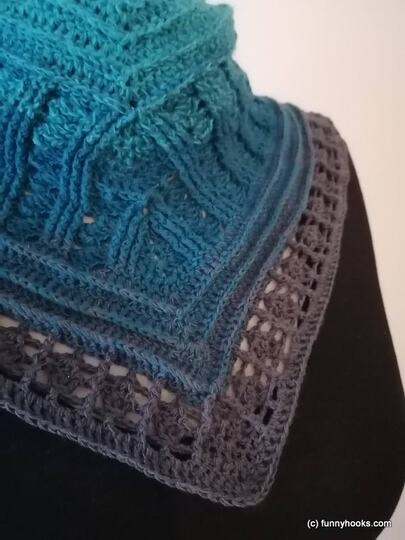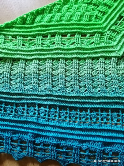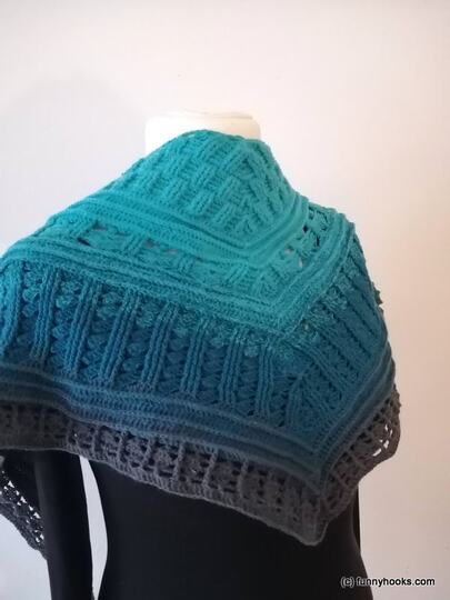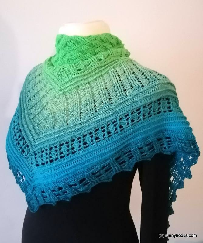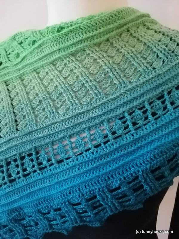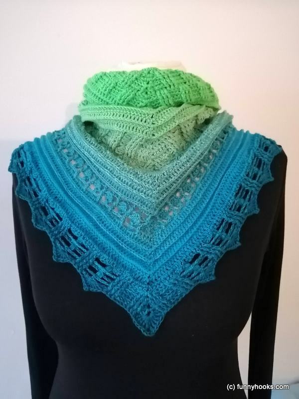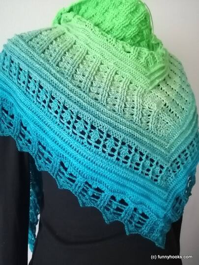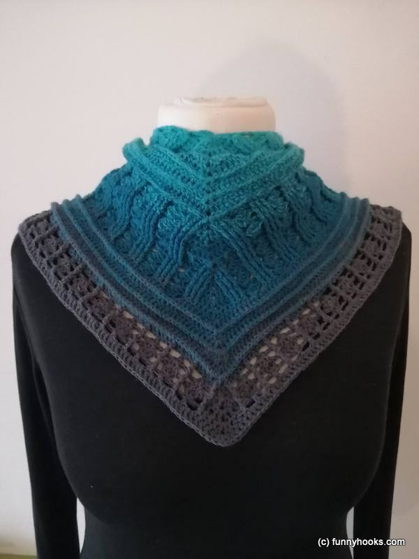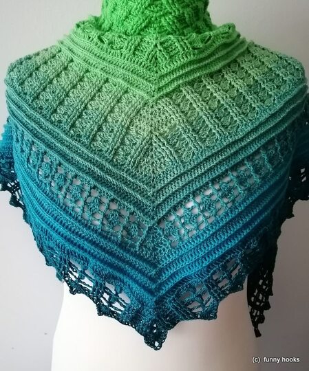 Abrienda ist das Tuch aus dem gleichnamigen Funny Hooks CAL. Es handelts ich um ein flaches, nicht so tiefes Dreieckstch, besteht aus vielen Reliefmustern und passt einfach überall.