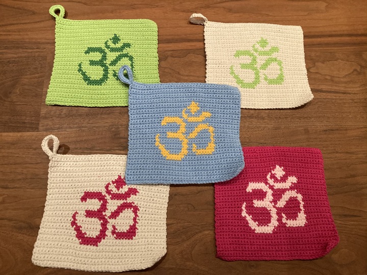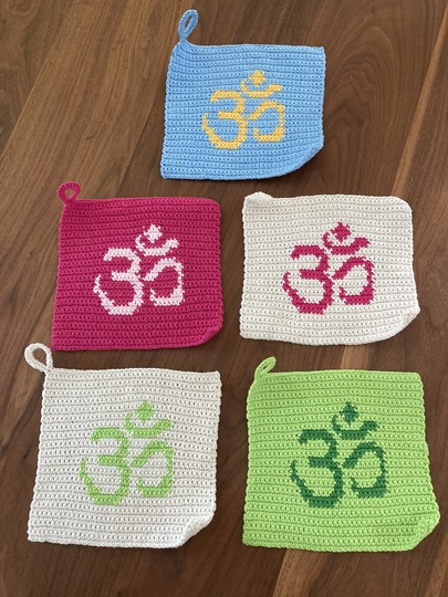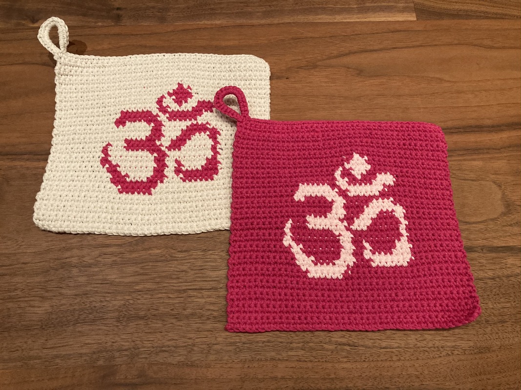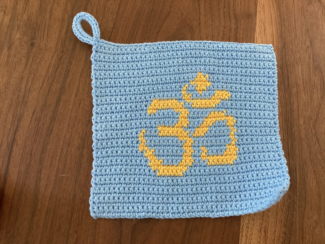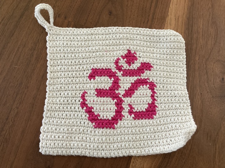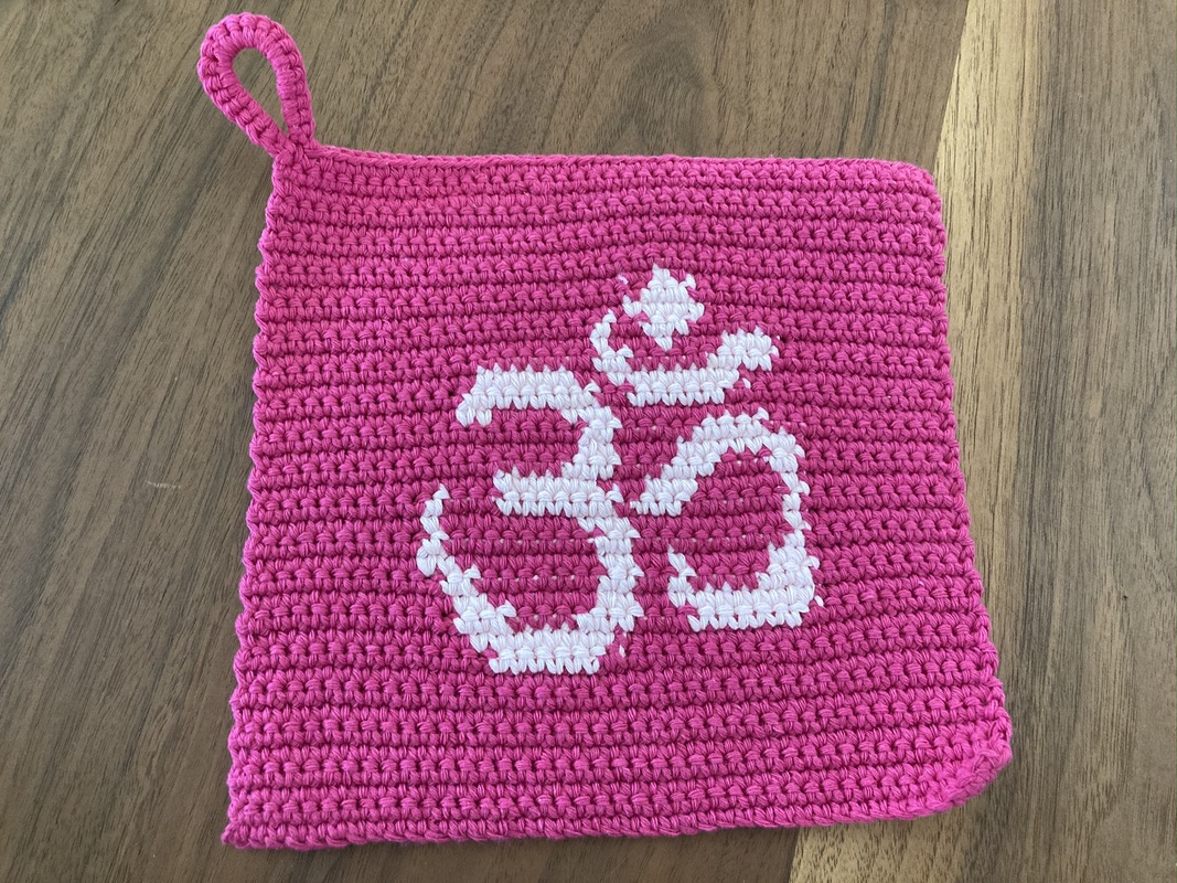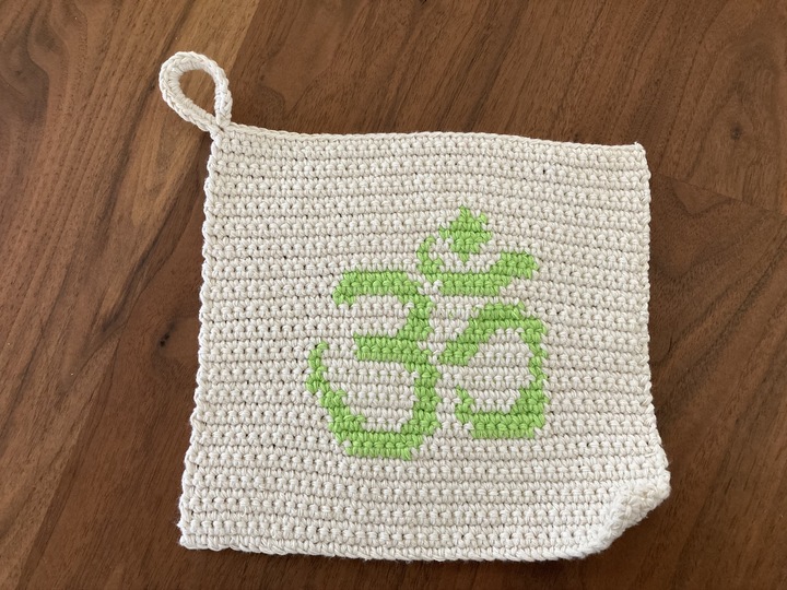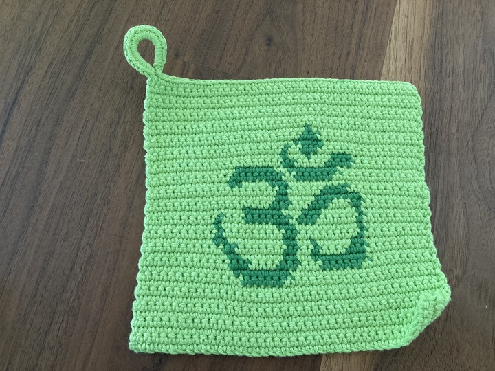 Diese Topflappen mit dem Sanskrit-Symbol des "OM" bringen sicherlich jeden Yoga- und Meditationsfreund zum Strahlen. Da macht das Kochen gleich noch mehr Freude.