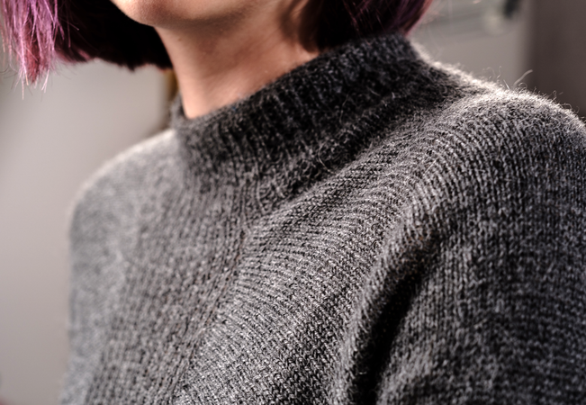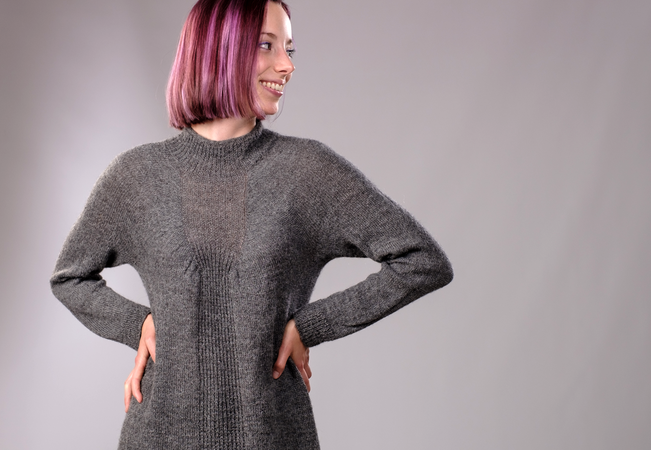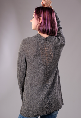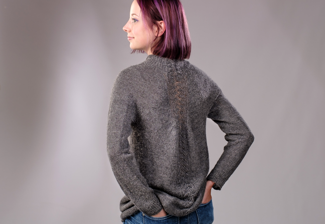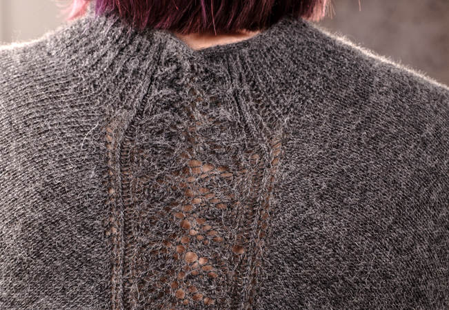 "Karla" wird von oben nach unten in einem Stück gestrickt. Der spezielle Schnitt resultiert aus der Zunahme-Methode im oberen Bereich. Sie ist ähnlich wie bei einem Raglan, die Zunahmen werden lediglich an einer anderen Stelle gearbeitet. Gestrickt wird glatt rechts, im Vorderteil wird ein Musterstreifen im Rippenmuster eingearbeitet, im Rückenteil einer im Lacemuster. Aber wie gesagt: Der Pullover kann auch andersherum getragen werden.