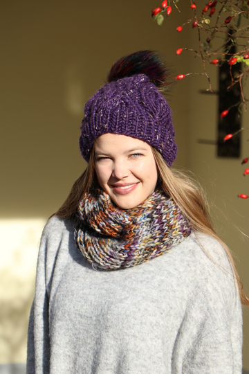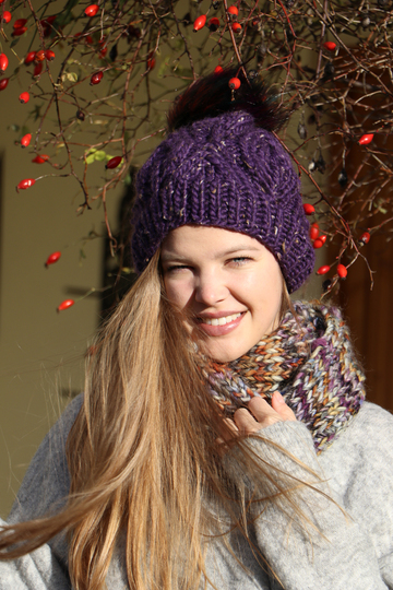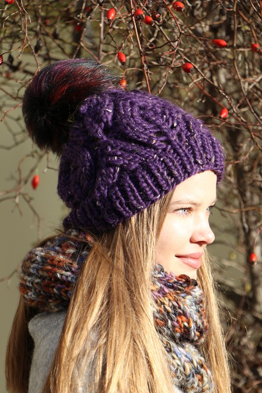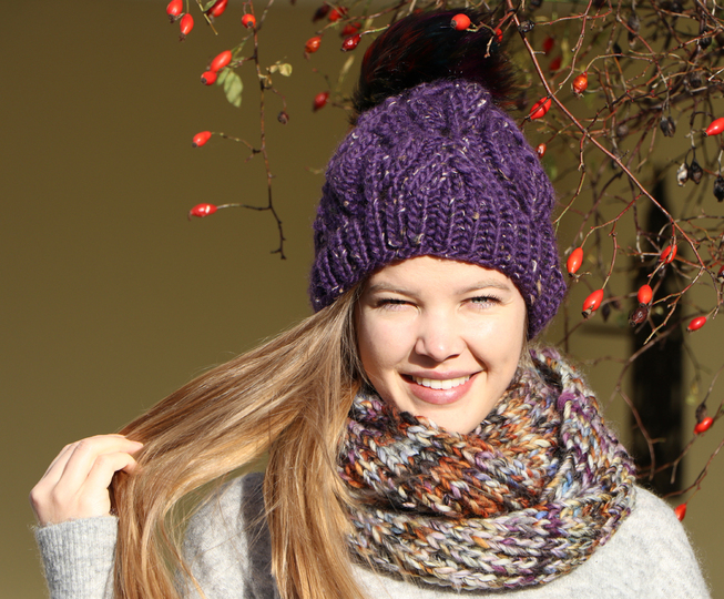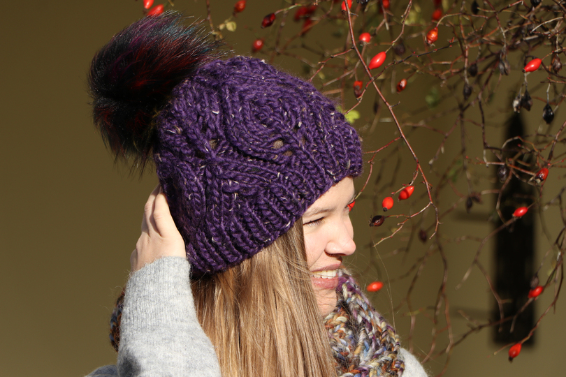 Material: Wolle 100 Gramm Gedifra Riana Big*), 50 Prozent Schurwolle, 45 Prozent Polyacryl, 5 Prozent Viskose, Dunkellila, Farbnummer: 03606, 1 Nadelspiel Stärke 10, 1 Rundnadel gleicher Stärke, 1 Stopfnadel zum Fäden vernähen, ein farblich passender Kunstfellbommel