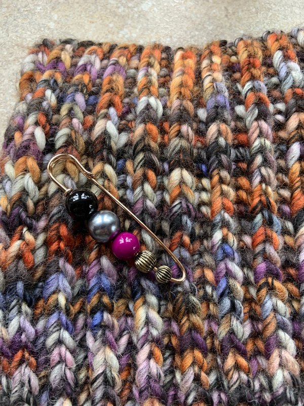 Material: 2 Knäuel (= 200 Gramm) Wolle Lyonel von Lang Yarns 86 Prozent Schurwolle, 14 Prozent Polyacryl, Farbnummer: 1020, 1 Nadelspiel Stärke 10, wer locker strickt, nimmt die vom Hersteller vorgegebene Stärke 9. Wer mag: eine verzierte große Sicherheitsnadel von Prym oder eine andere Brosche.