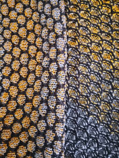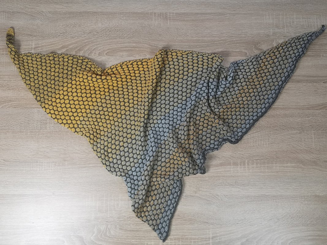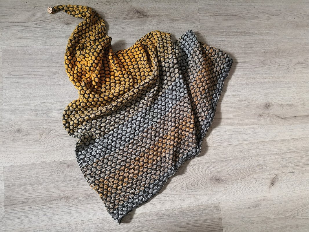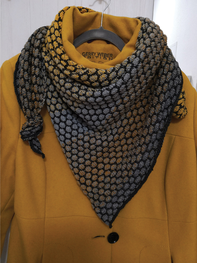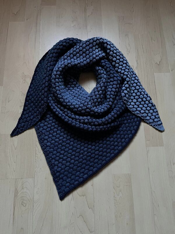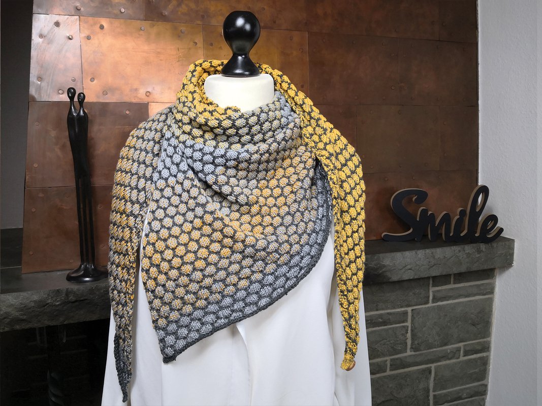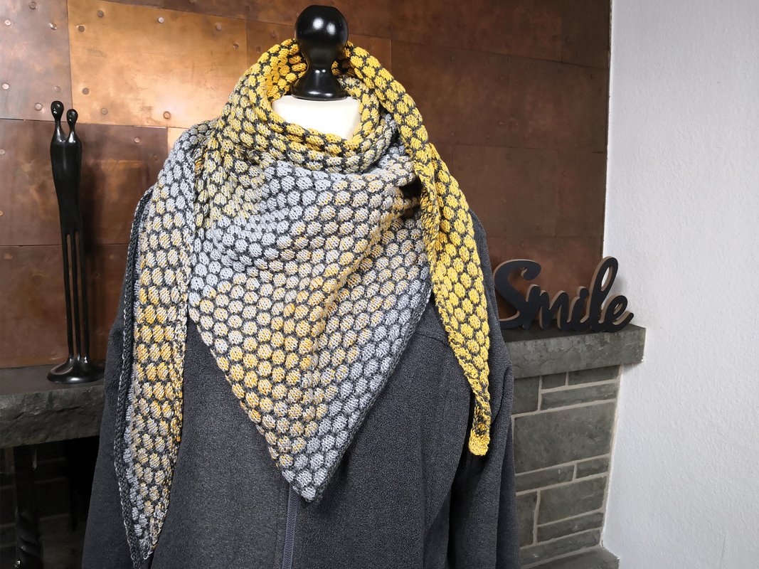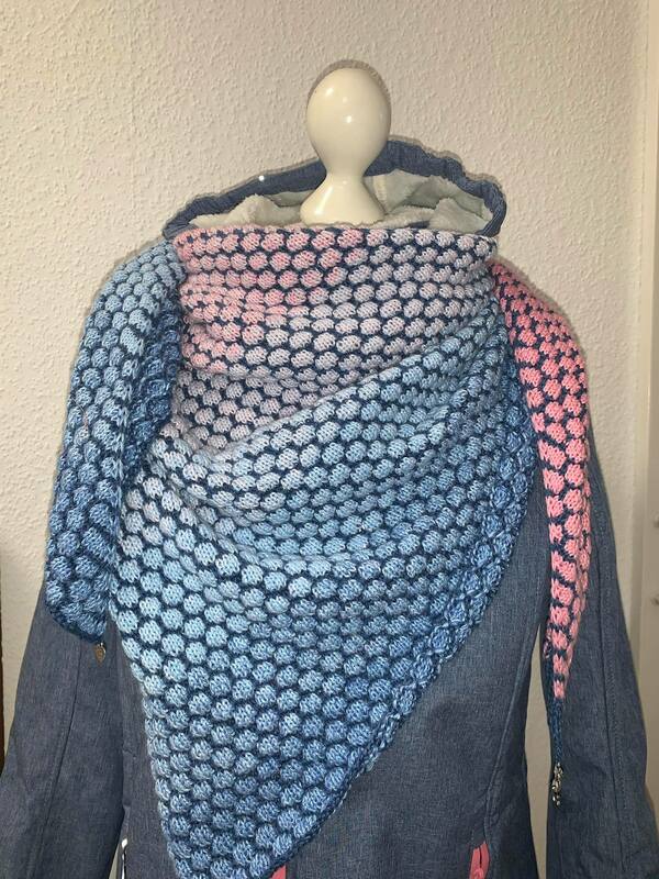 Mein Tuch ist an der längsten Seite ca. 150 cm lang. Da das Muster plastisch ist wird mehr Garn als gewöhnlich benötigt.