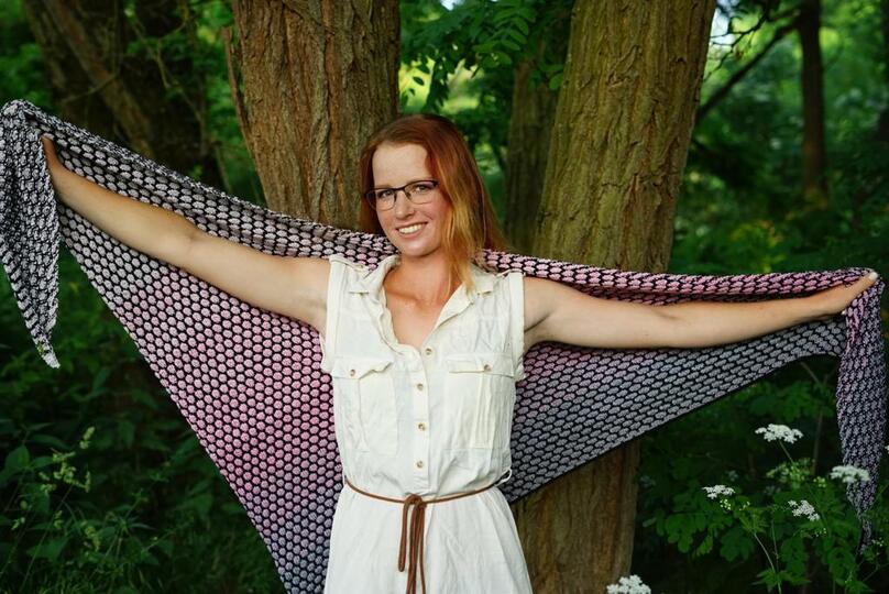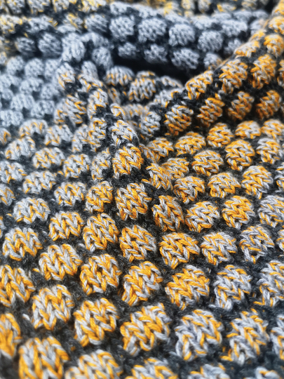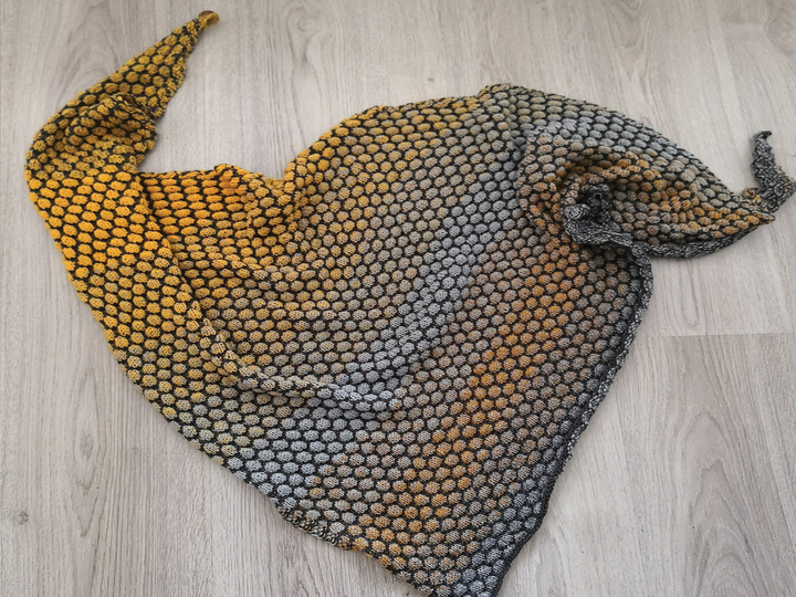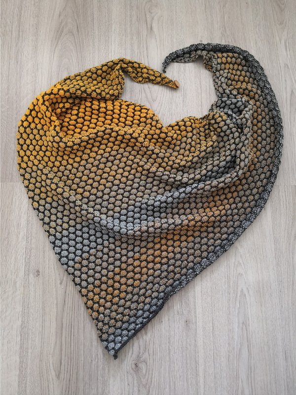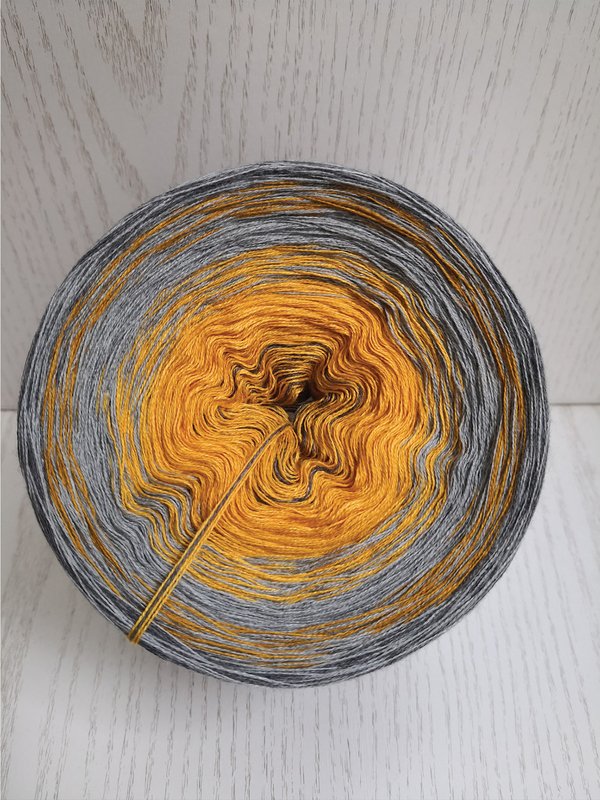 Im Beispieltuch wurde der Farbverlaufsbobbel „Curry Liesl “ in 4 fädig mit 600 Meter Lauflänge verwendet plus 300 Meter Kontrastfarbe. Das Garn besteht aus 50% Baumwolle und 50% Polyacryl und ist von Mein Farbrausch - Ria Holz.