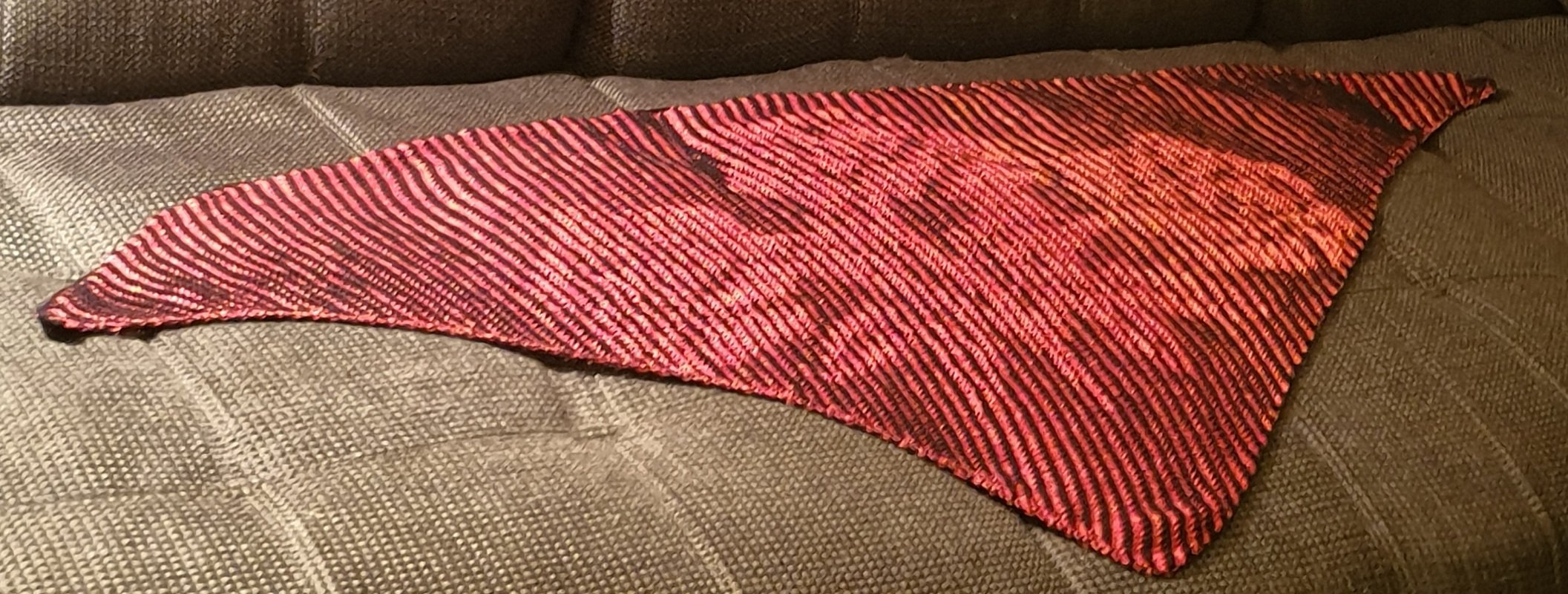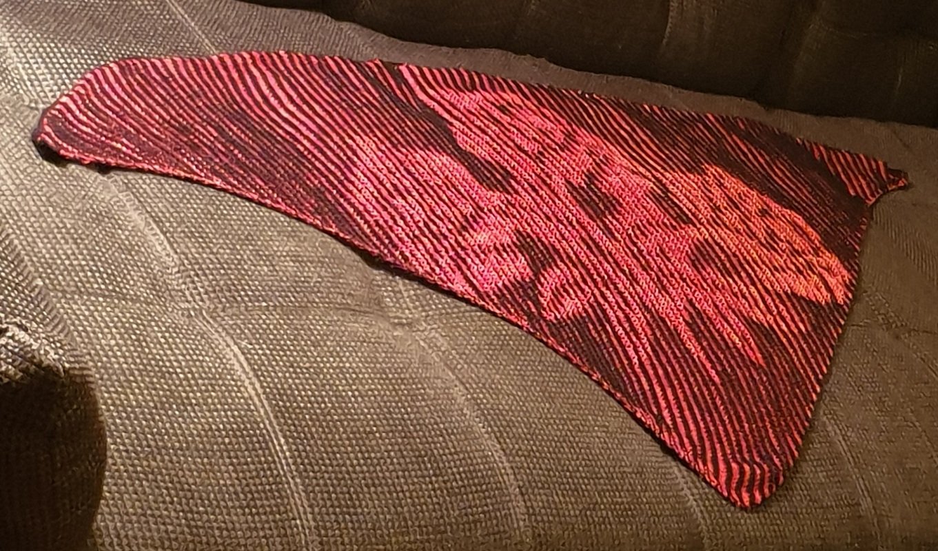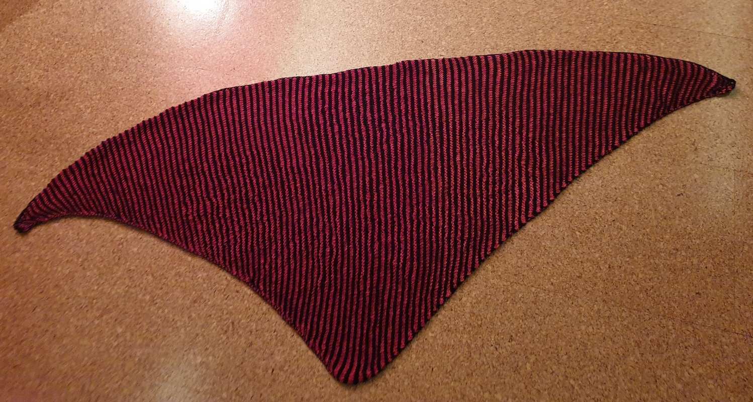Das Rosentuch wurde aus zwei 4fädrigen Bobbeln schattengestrickt und die obere Kante mit einer Reihe feste Maschen behäkelt. Es hat eine Größe von 1,60 x 0,60 m.