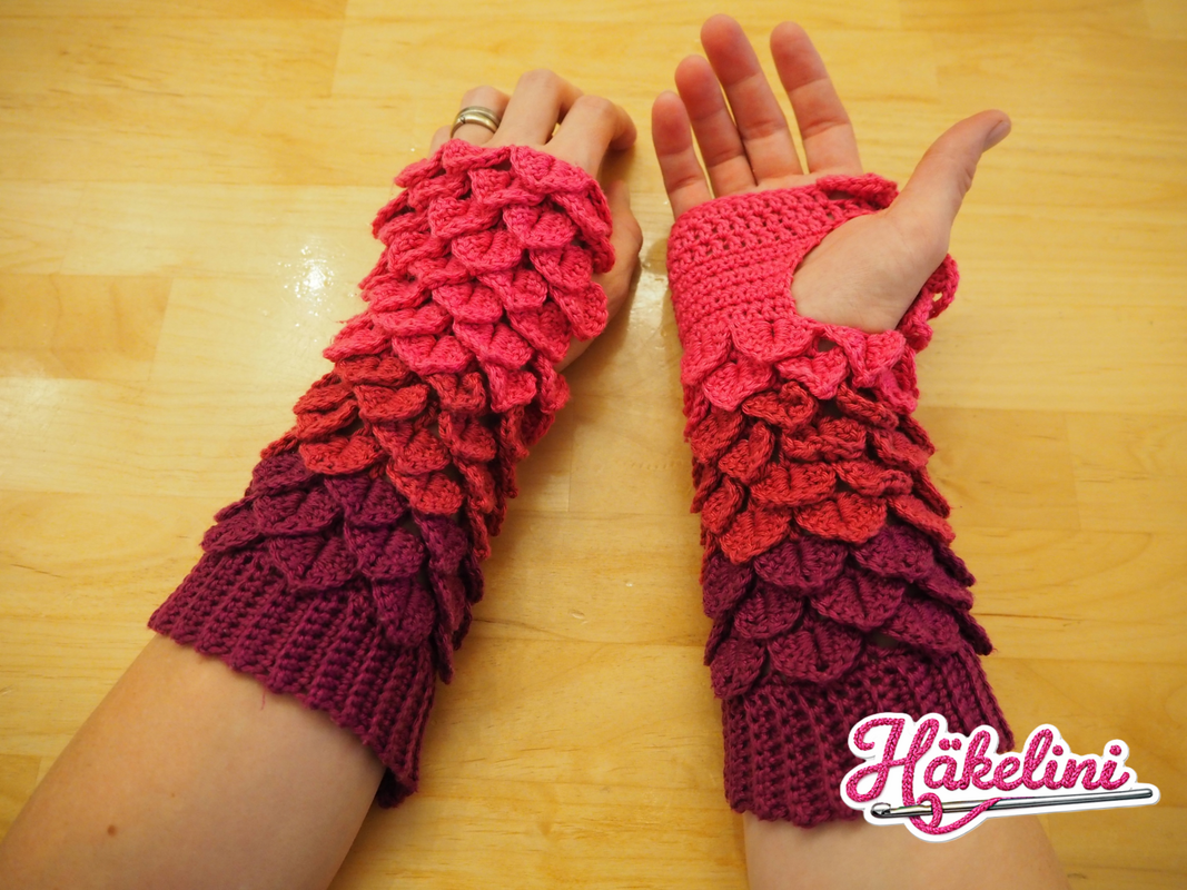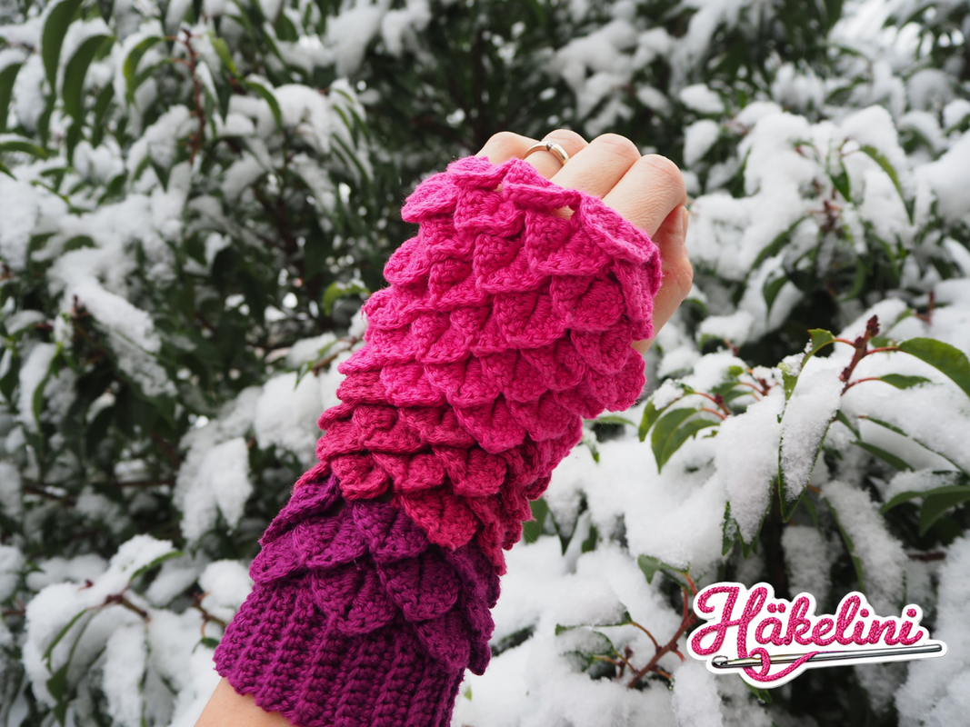 Diese außergewöhnlichen Handstulpen vereinen Wärme, Stil und Handwerkskunst in einem einzigartigen Design. Das aufwendig gearbeitete Schuppenmuster verleiht Ihnen eine faszinierende, dreidimensionale Struktur – inspiriert von zarten Drachenschuppen.