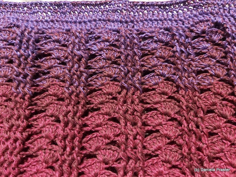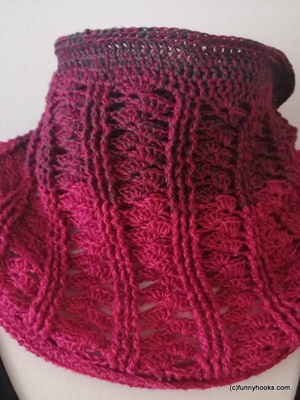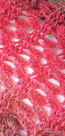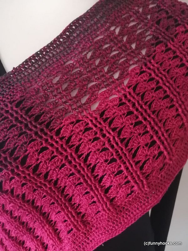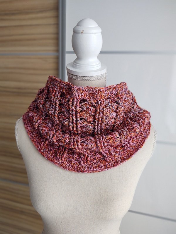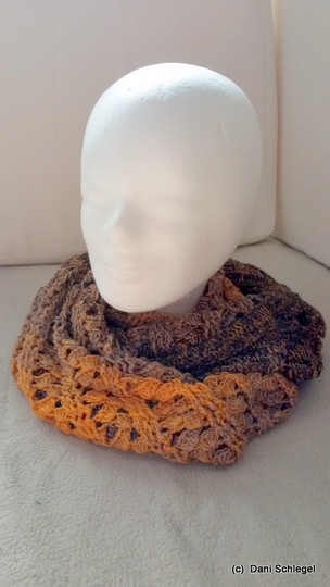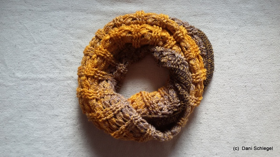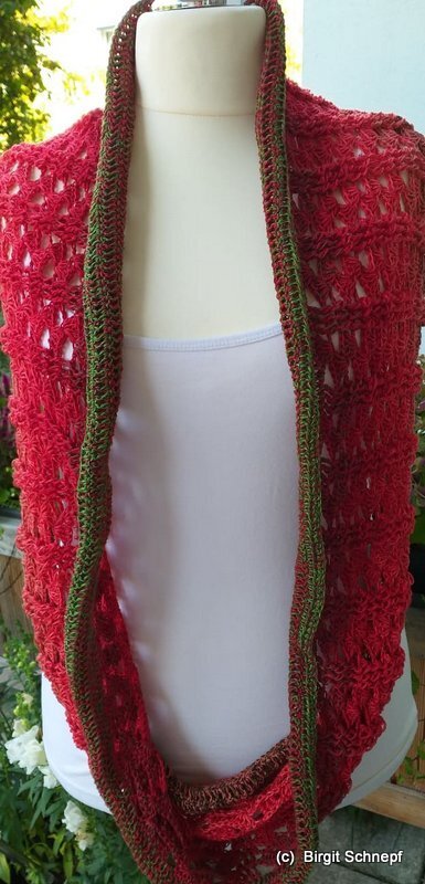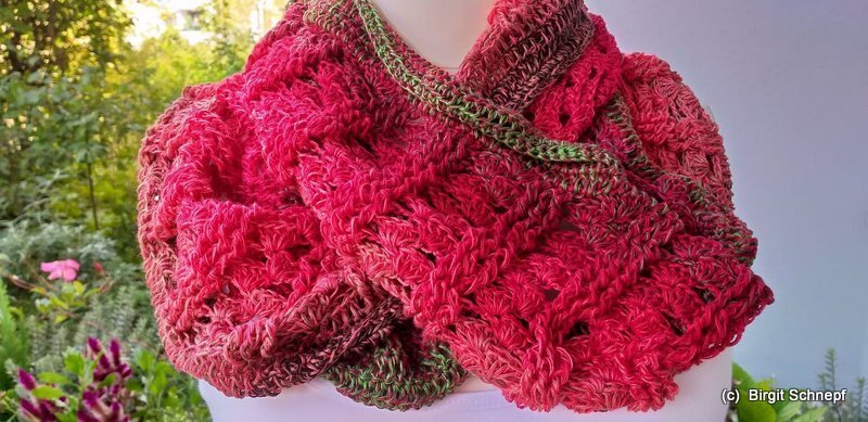 Er kann als Loop gearbeitet werden oder auch als Schlupfschal. Wie der Schal angepasst werden kann, steht in der Anleitung.