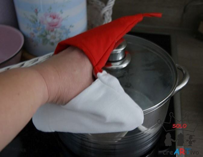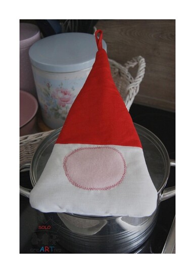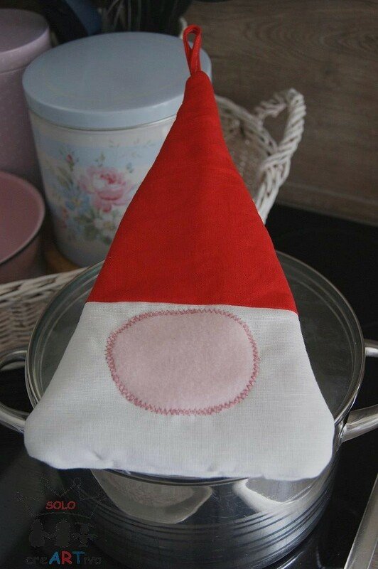 Bebilderte und einfach erklärte A4 - Kurzanleitung für einen Weihnachtswichtel Topfhandschuh.