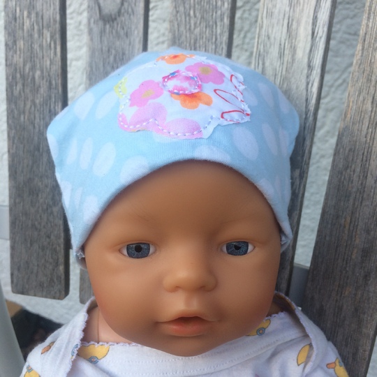 Die Größe der Mütze ist am Ende 16 x 12 cm. Es eignet sich für Puppen mit einem Kopfumfang von 34 cm.