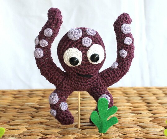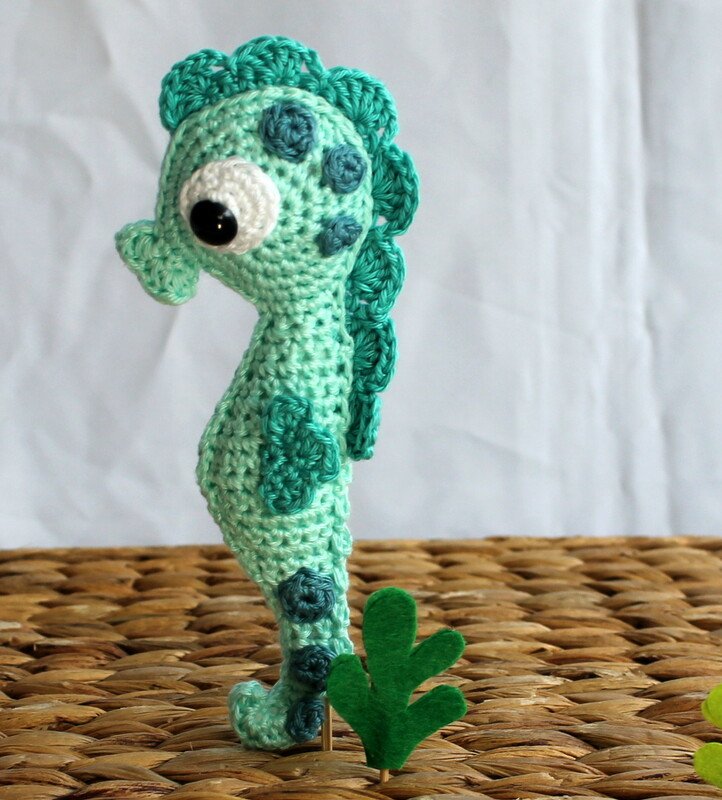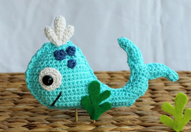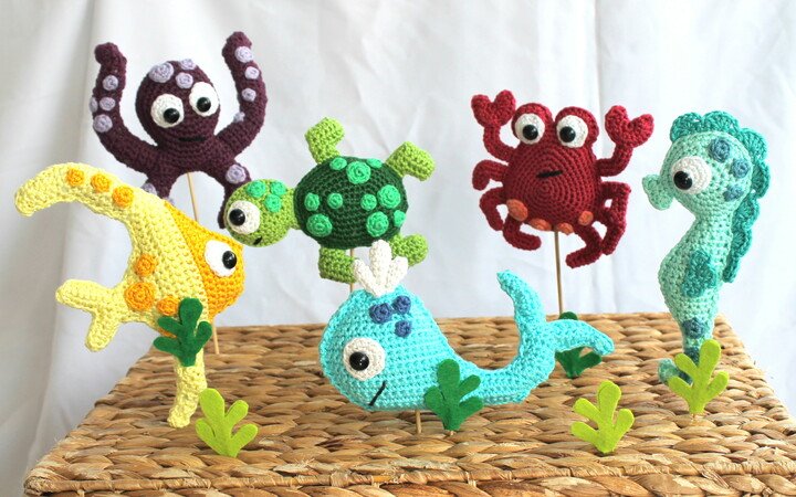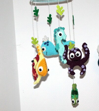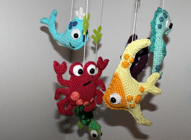Hier findest Du die Anleitung für den gelben Fisch, das Seepferdchen, die Krake, die Krabbe, den Wal und die Schildkröte. Ebenfalls eine Erklärung, wie hieraus ein Mobile gemacht werden kann.