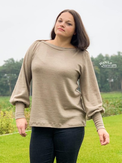 Libby ist ein wunderbarer Basic-Schnitt mit Ballonärmeln, den du je nach Ausschnittvariante und Stoffwahl zu einem legeren Basicteilchen oder zu einem eleganten Alltagsbegleiter verwandeln kannst. Der Clou ist sicherlich die Fake-Knopfleiste an der Schulter.