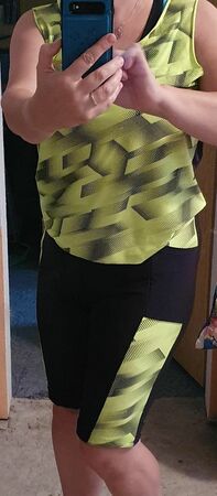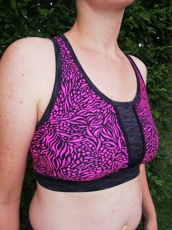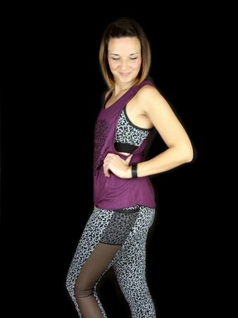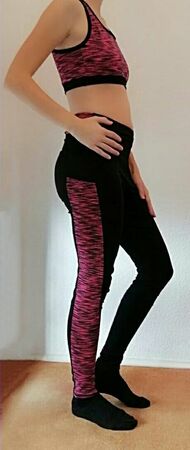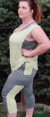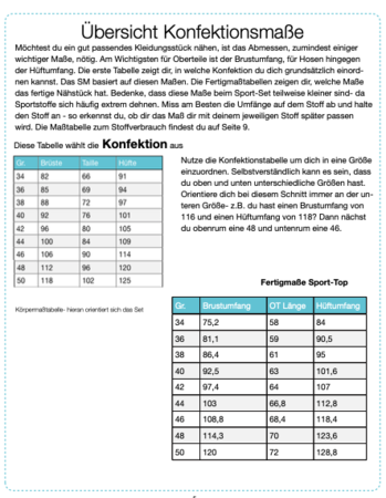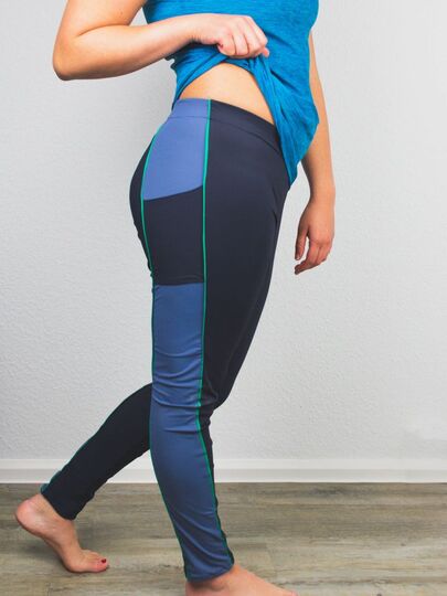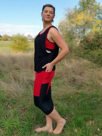Ich möchte mit diesem Ebook die Angst vor "Sport-Stoffen" nehmen und dich Schritt für Schritt an dein eigenes komplettes Sportoutfit heranführen. Lycra z.B. kannst du im Grunde wie Jersey nähen! Es ist auch nicht unbedingt notwenig Bauschgarn zu verwenden, dieses besonders weiche Garn kann nur den Tragekomfort erhöhen, ist aber nicht ausschlaggebend für das Gelingen des Sets. Ich selbst trage beim Sport (Yoga und Fitnessstudio) gerne etwas unterstützendes für die Brust, darüber etwas weich fließendes, das verdeckt und luftdurchlässig ist. So ist das Top entstanden. Ich mag enge Yoga/Sportleggings und ärgere mich bei gekauften über fehlende Taschen. Natürlich sollen diese nicht als Beutel irgendwo am Bein reiben, deswegen habe ich die außen angesetzte Tasche gestaltet, die eine Mitgliedskarte und ein Handy mit sich tragen kann, ohne den Bewegungskomfort einzuschränken. Die Leggings lässt sich nach belieben auch auf 7/8 Länge, 3/4, Hotpants- oder als Radlerhose gestalten. Sie ist hoch geschlossen (high waist), sodass sie je nach Befinden auch etwas Bauch zeigt, die Hüften und das Gesäß aber genug „anzieht“, dass mit ihr auch starke Verrenkungen (z.B. herabschauender Hund beim Yoga) möglich sind. Das Bustier hat Markierungen für das Einnähen von BH Schalen und verfügt über eine Teilung zwischen den Brüsten. Hier empfehle ich, einen sehr atmungsaktiven Stoff einzufügen. Optional kannst du diesen Stoff auch an den Bustier-Seiten, also unter den Achseln einsetzen. Ich empfehle das Bustier doppellagig zu nähen, außen Lycra, innen einen saugfähigeren, atmungsaktiven Stoff wie Gemische aus Polyester und Elasthan (Polyester-Spandex-Mesh) mit kleinen ausgestanzten Löchern. Das Bustier ist ab einem C-Körbchen nicht zum Joggen geeignet.