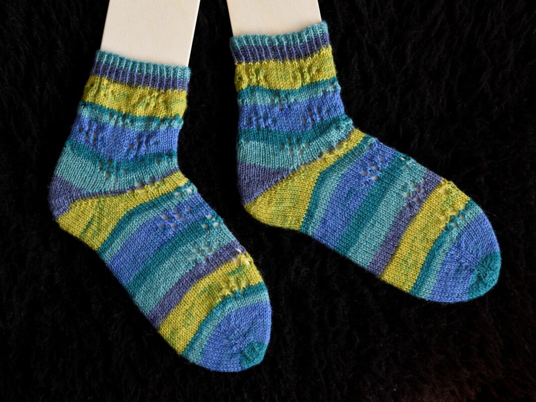 Erinnerung an den Sommer - Sonnenlicht glitzert im Meer, bunte Fische tummeln sich im Wasser, Algen schwingen hin und her.....diese Socken in leuchtenden Wasserfarben mit einem an Luftblasen erinnernden Lochmuster retten Deine Urlaubsbilder in den Herbst!