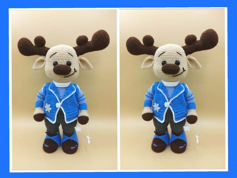 Ich habe Ebbo den Elch mit einer Häkelnadel der Stärke 2,0 und dazu passender Wolle gearbeitet und er hat bei mir eine Größe von ca. 40 cm.