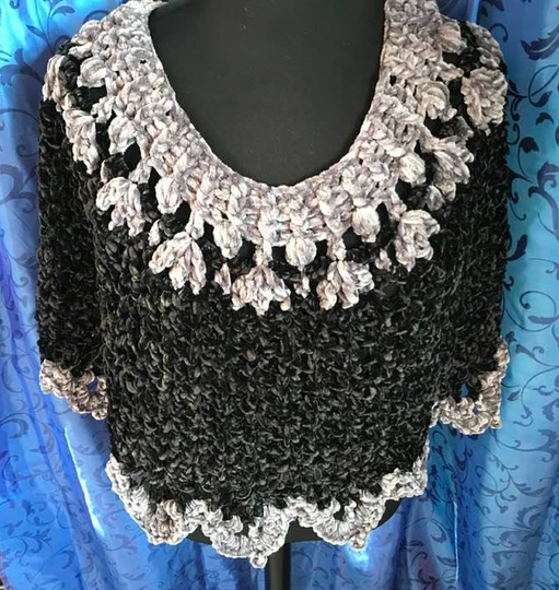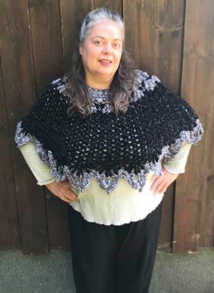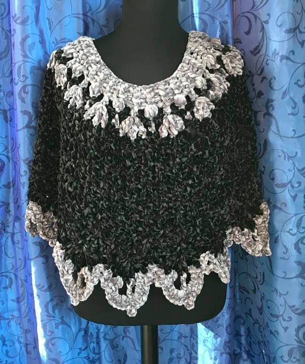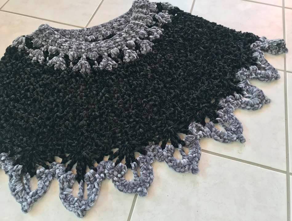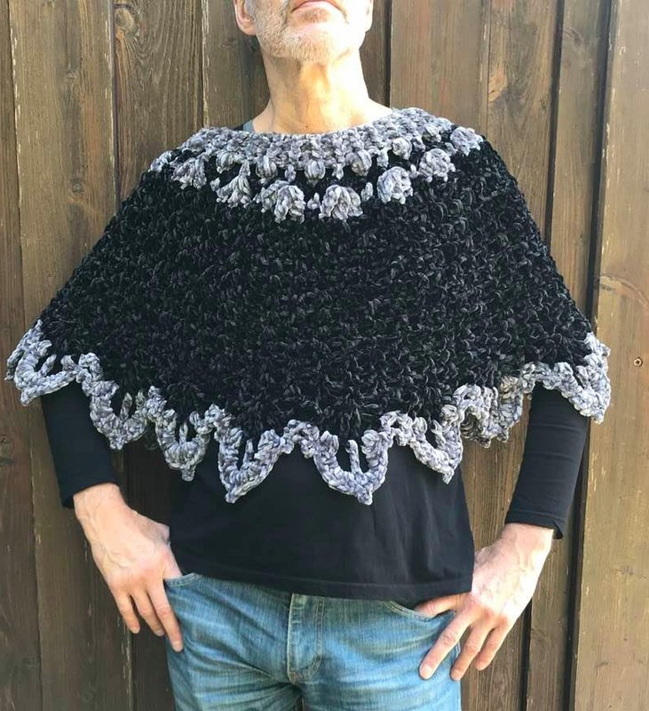 Poncho "Teddy" passt für die Größe 44 - 54 prima... wenn Du den Poncho länger machen willst, dann geht das wunderbar in dem schwarzen Teil..dann braucht Du aber eine schwarzen Knäul mehr..sind dann ca. 4 Reihen und um die 9 cm.