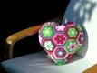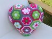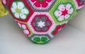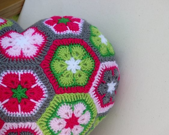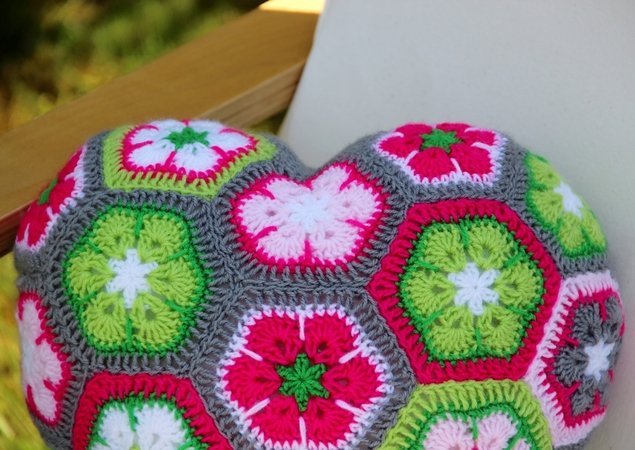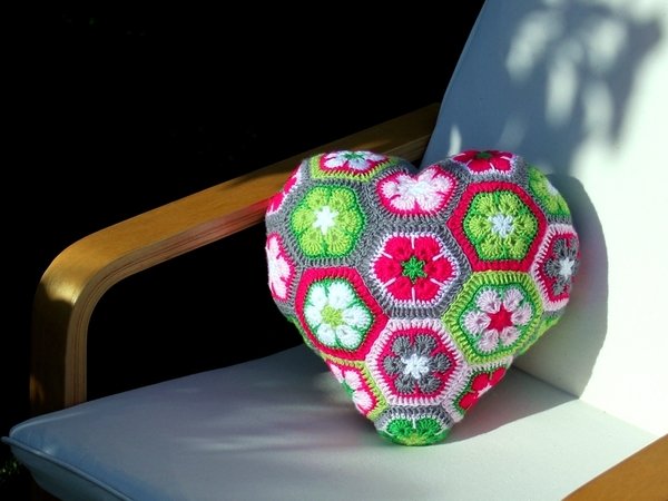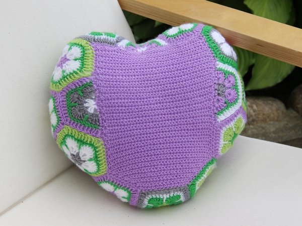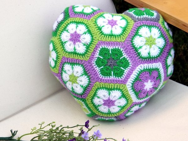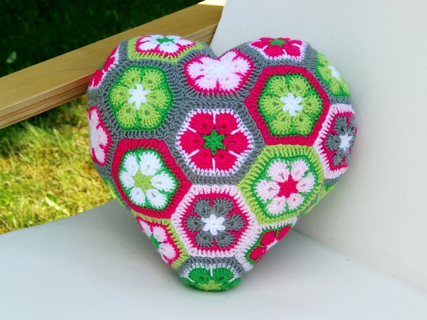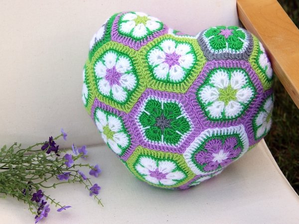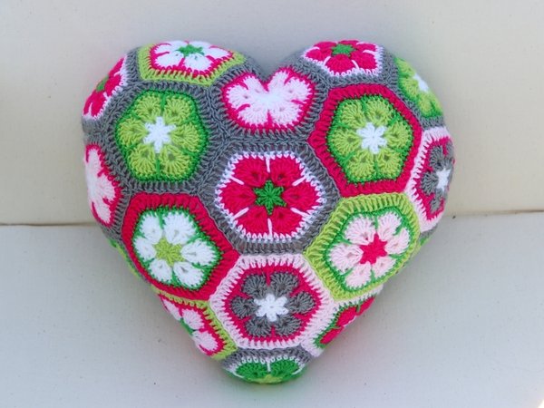 Dieses Herzkissen lädt zum Knuddeln ein. Wer es einmal in den Händen hält, gibt es nicht mehr her. Und es ist gar nicht schwer zu häkeln. Das Kissen besteht aus 18 ganzen und 3 halben Sechsecken. Man kann die Einzelteile sehr gut unterwegs im Urlaub oder irgendwo im Wartezimmer fertigen. Erst zum Schluss werden sie aneinandergefügt und zum Herz geformt. Die Rückseite ist unifarben. Es braucht keinen Verschluss, weil es rundherum geschlossen ist. Es ist in der Waschmaschine waschbar, da die Füllung aus waschbarer Synthetik-Watte besteht.